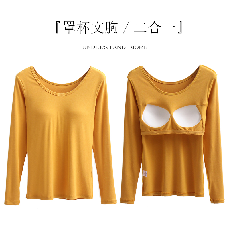 修身 t恤2022初秋新款 春秋冬上衣 女内搭带胸垫一体长袖 圆领打底衫
