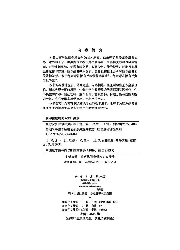 第二版 普通高等教育应用创新系列规划教材·经管基础课程系列 余学斌翟中伟 社 9787030470904 科学出版 证券投资学