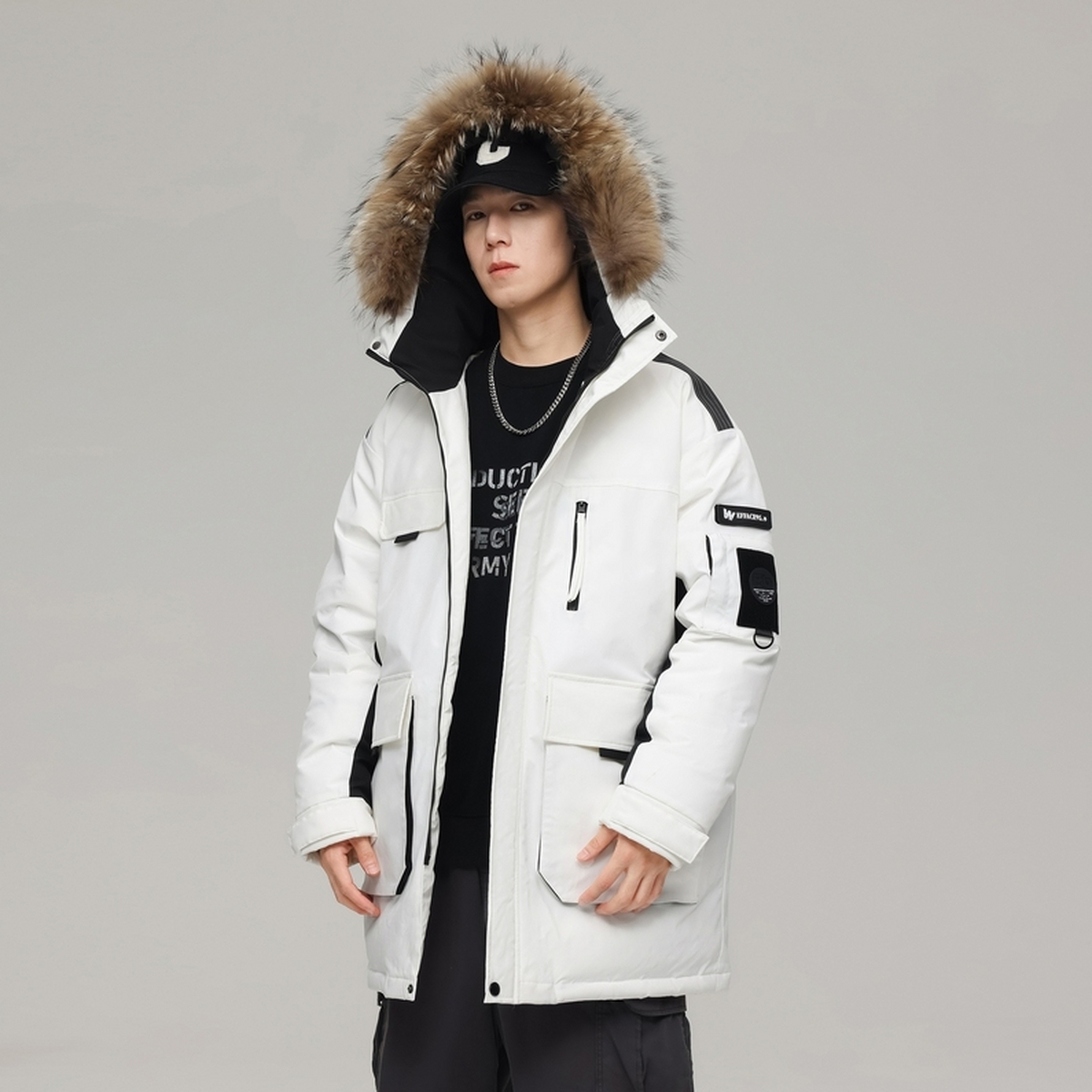 中性宽松 连帽貉子毛领羽绒服工装 雪中飞2025冬新款 男女情侣短款
