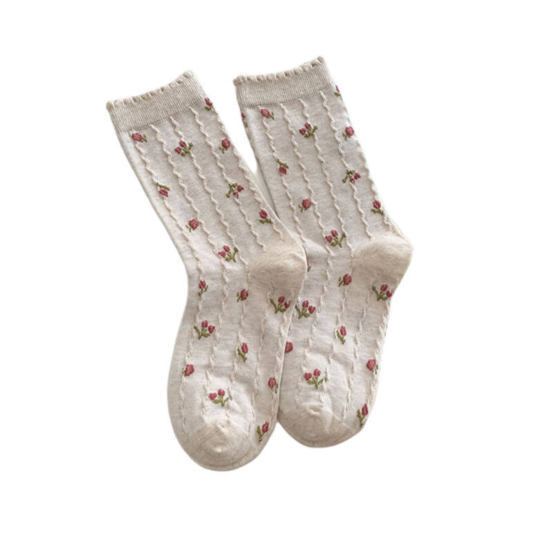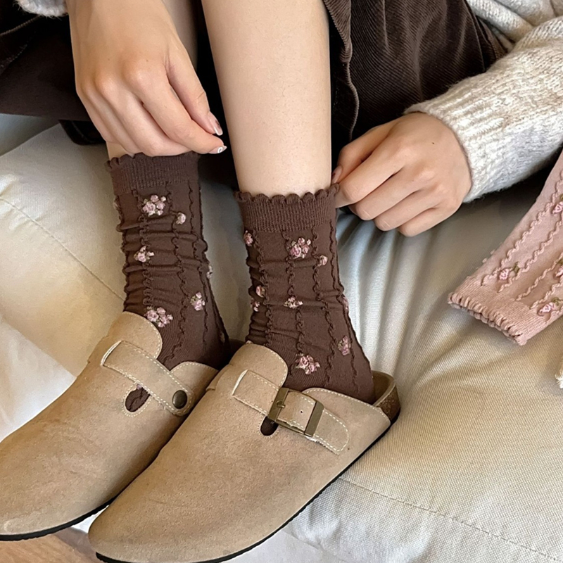 咖啡色系美拉德风韩式 袜子 碎花木耳花边外穿堆堆中筒女乐福小皮鞋