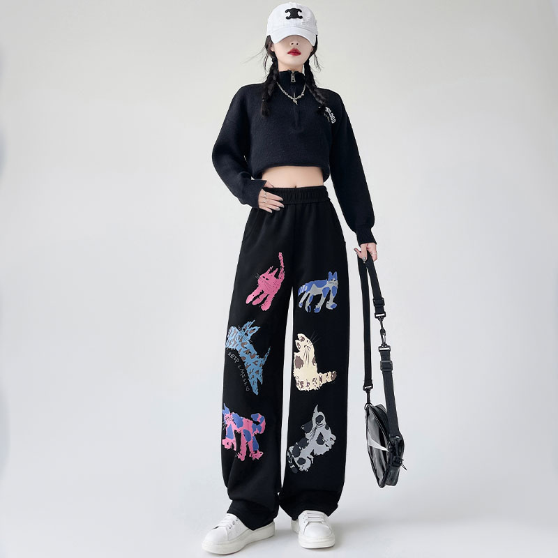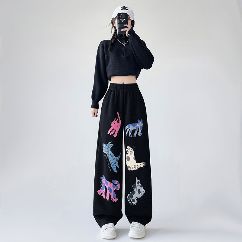 可爱小猫咪印花设计感减龄休闲裤 新款 女秋季 卡通动物涂鸦阔腿卫裤