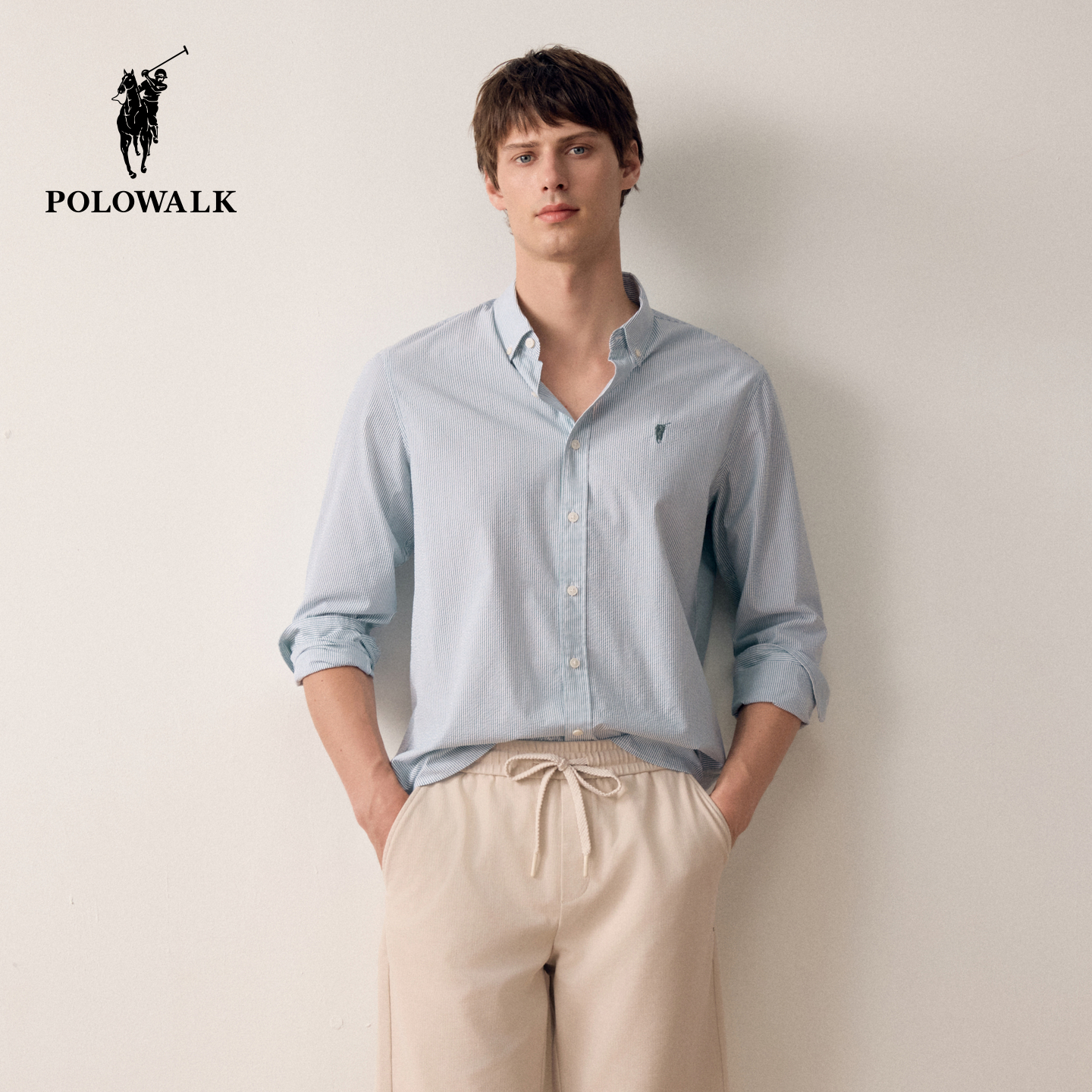 新品 POLOWALK男式 2025秋季 衬衫 条纹撞色翻领上衣商务休闲衬衣 长袖