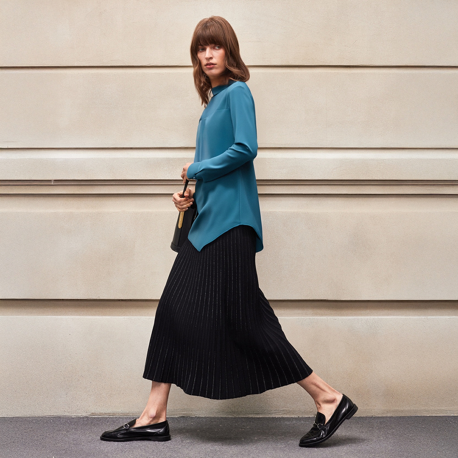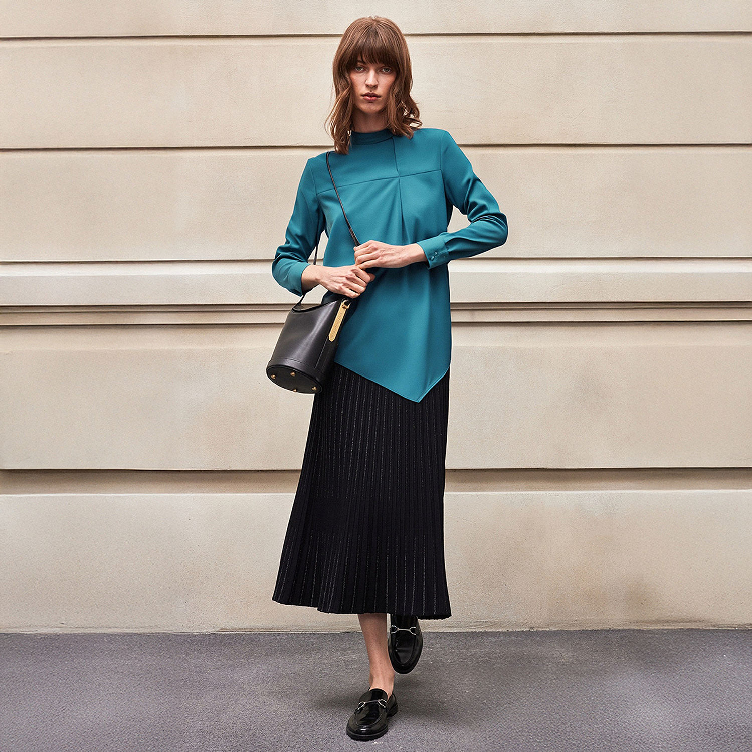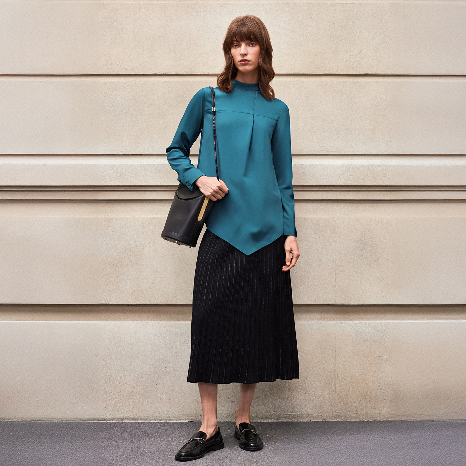 气质流行设计感小立领前身拼缝叠褶修饰柔软女衬衫 BCBG新款 时尚