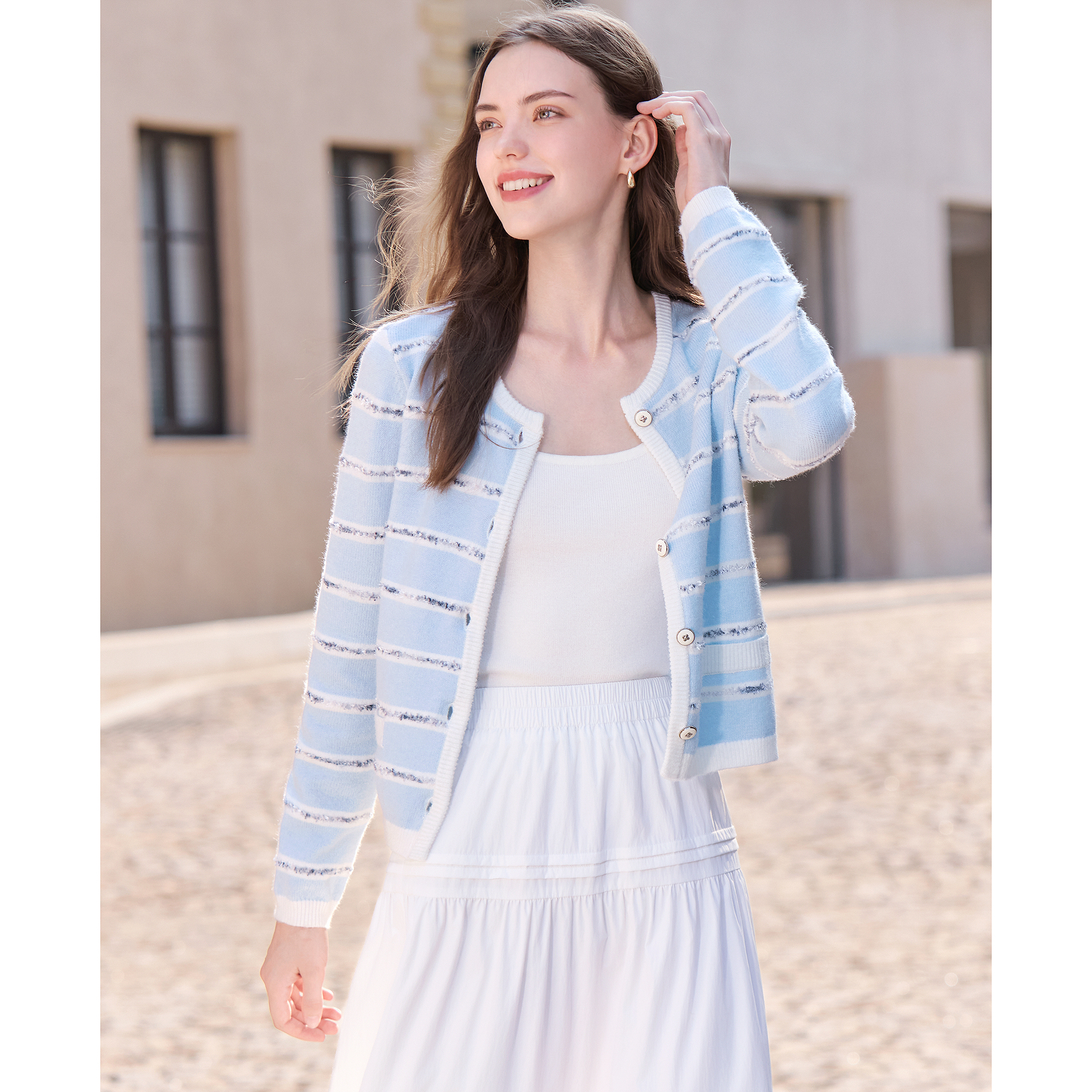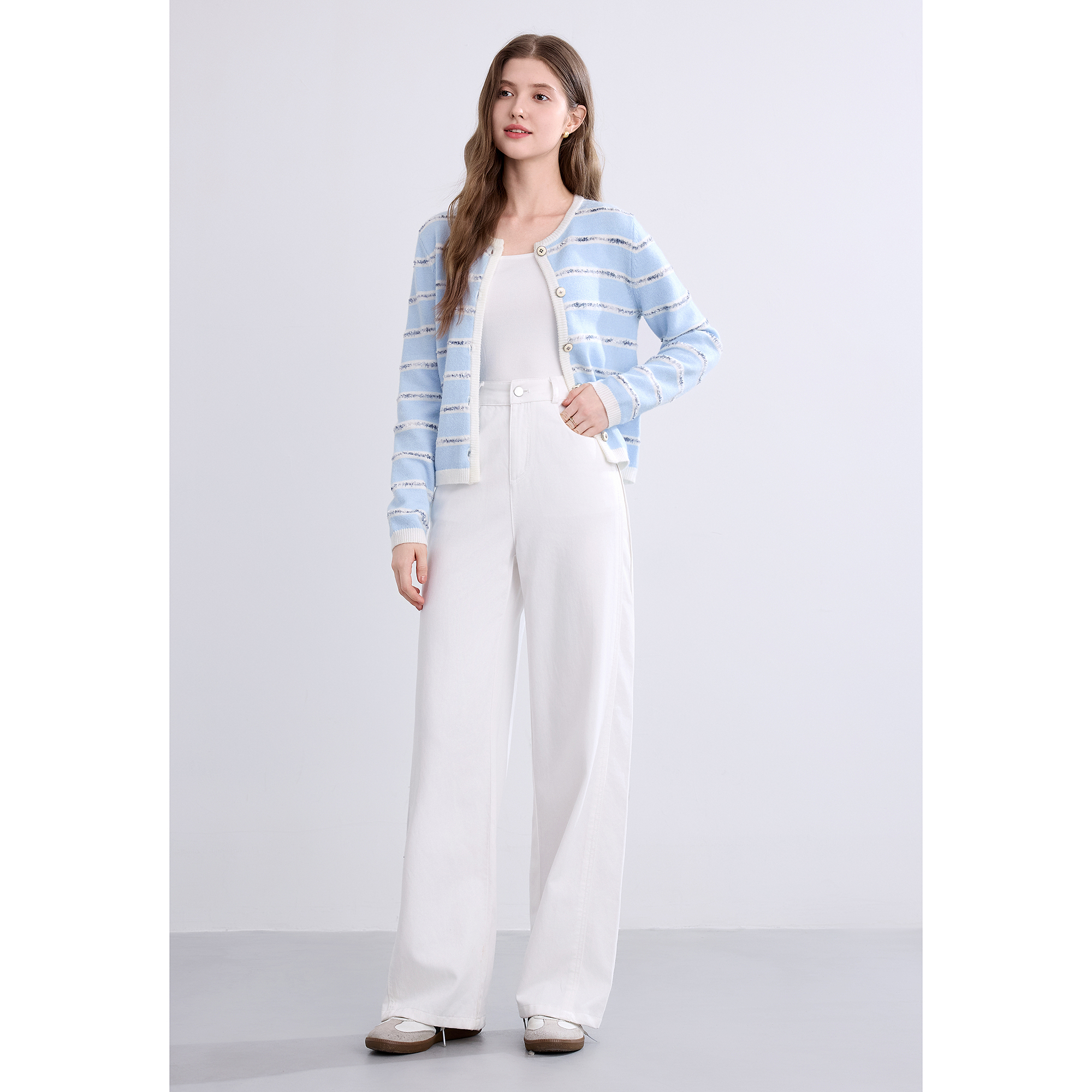 新款 betu百图法式 2025年秋季 女开衫 圆领百搭外套 蓝白条纹针织衫