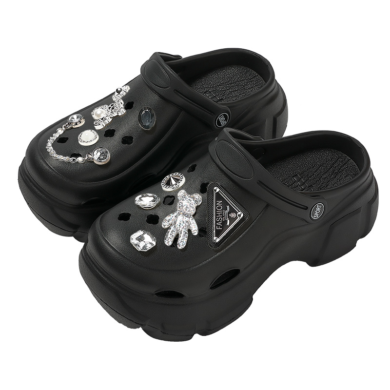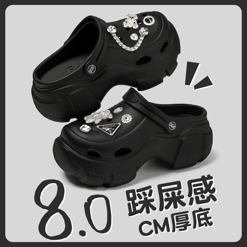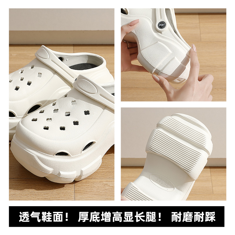 女款 包头半拖鞋 夏季 厚底沙滩防滑增高凉鞋 外穿2024新款 黑色洞洞鞋