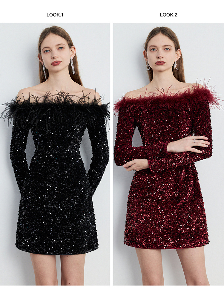 DPLAY冬一字肩领红色丝绒亮片A字修身 晚礼服礼服裙连衣裙女