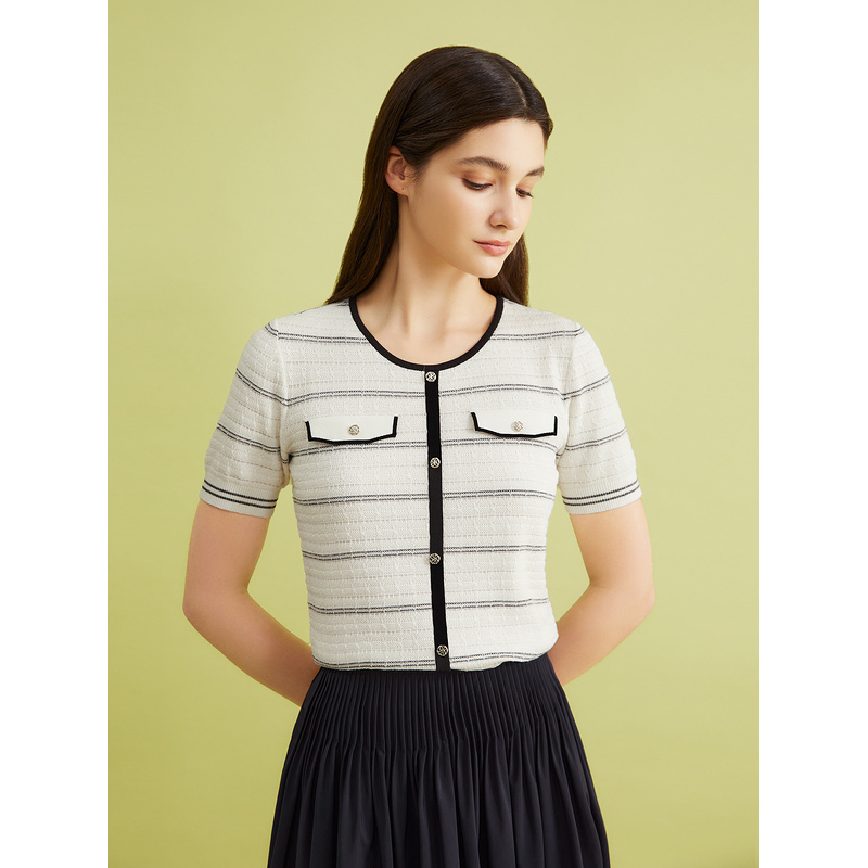 针织衫 条纹短袖 长袖 开衫 毛衣外套 RARN2025秋装 两件套圆领修身 新款