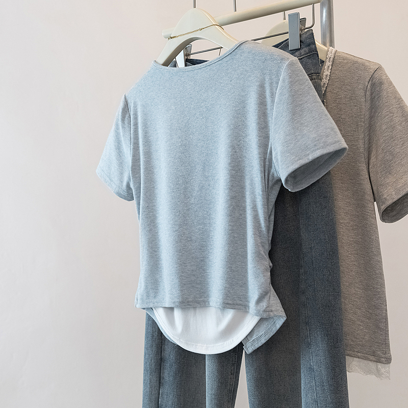 新款 T恤女2025夏季 收腰显瘦显气质上衣 蓝色假两件短袖 文艺风大码