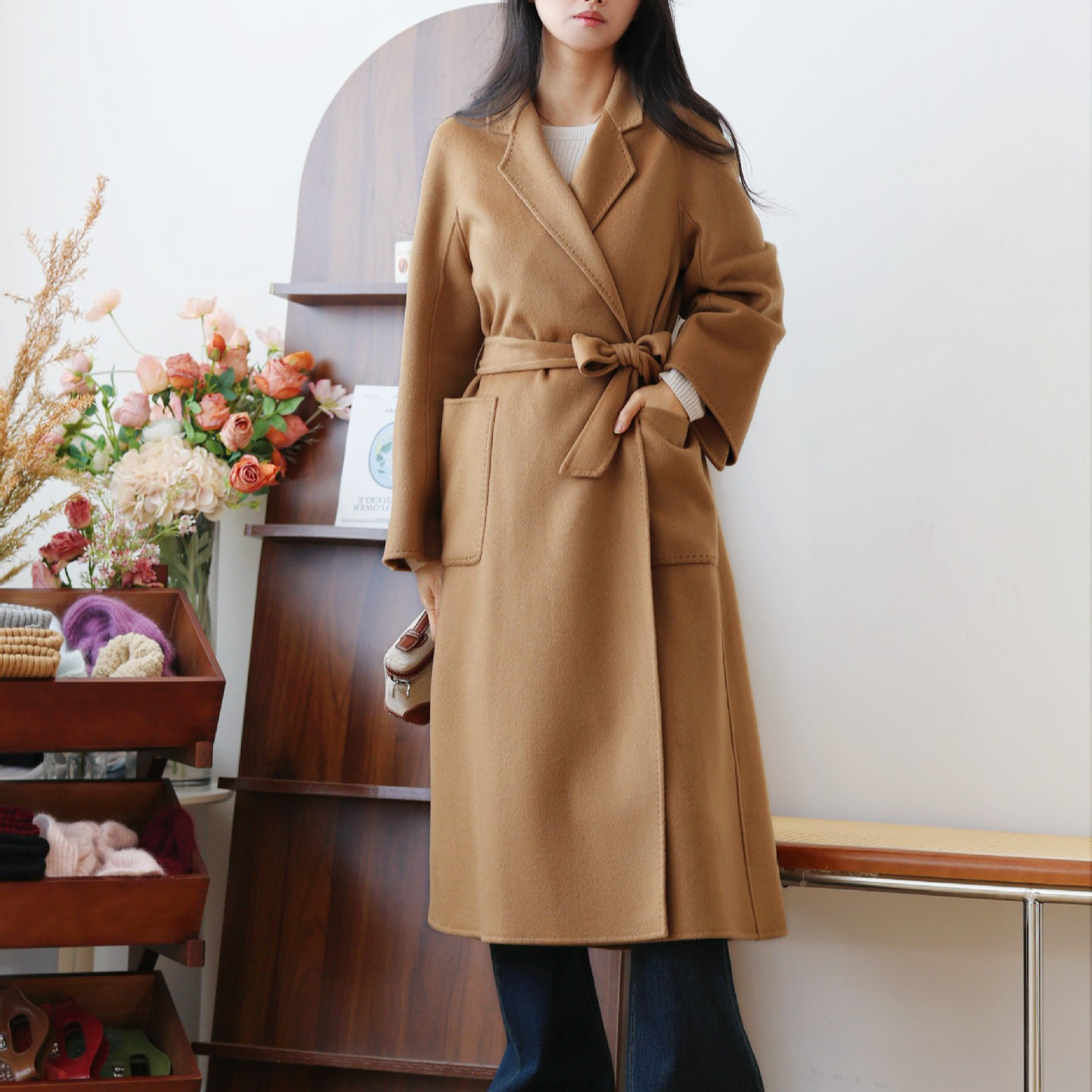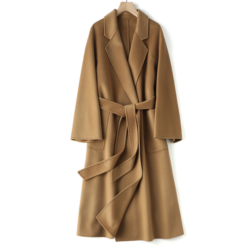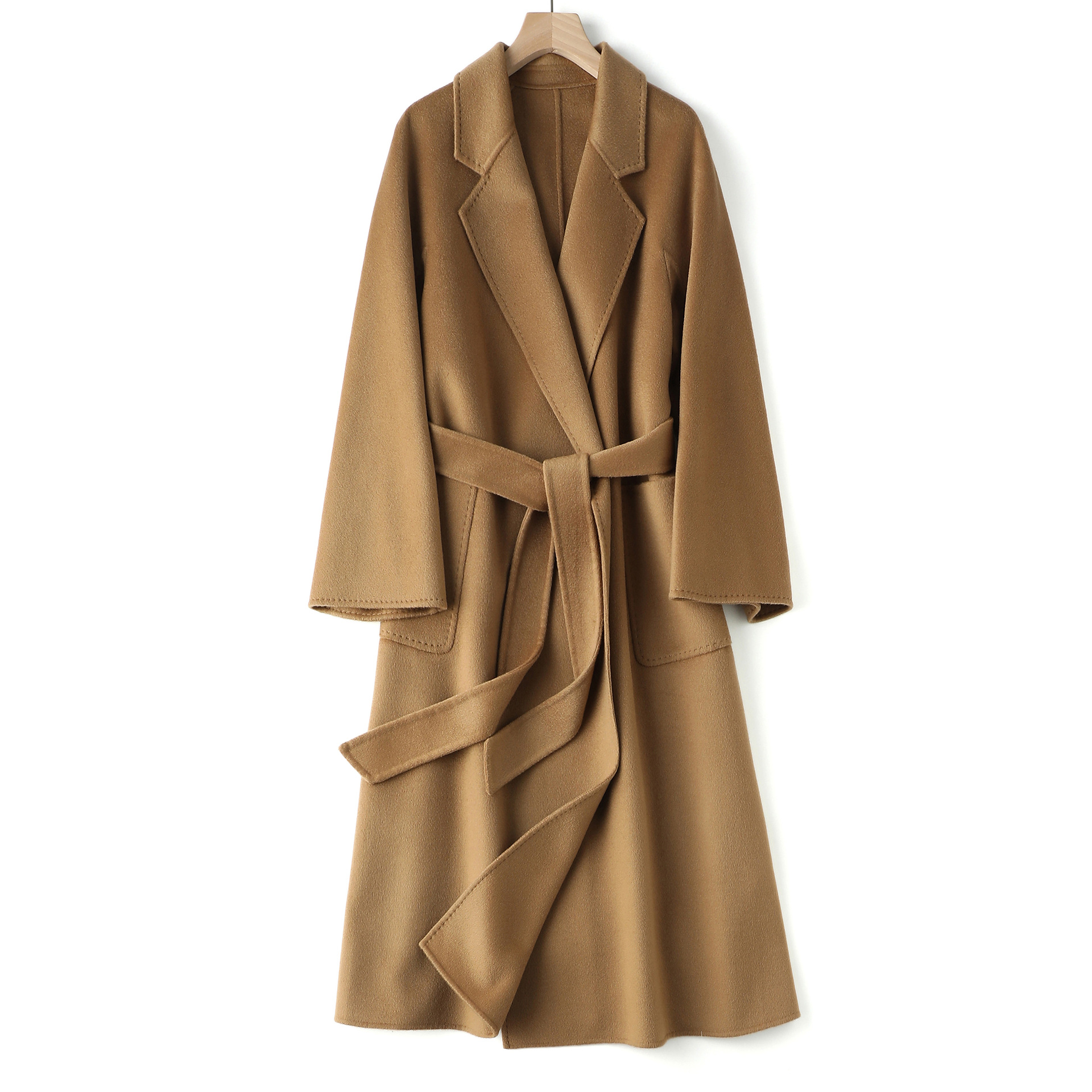 贝源M家明星同款 羊毛毛呢外套女 水波纹双面羊绒大衣女焦糖色长款