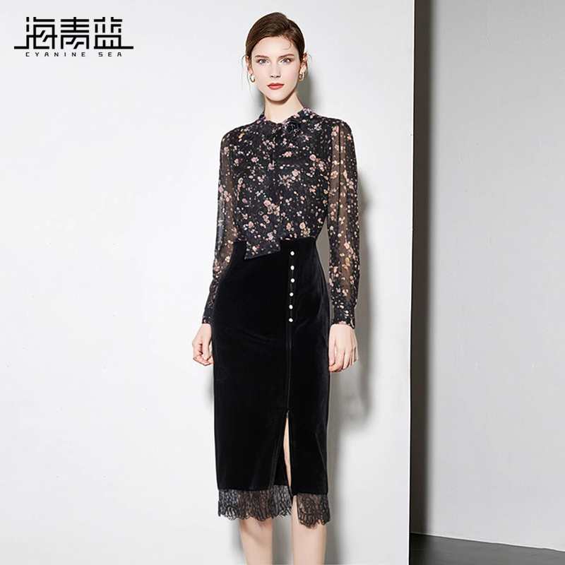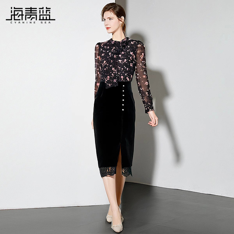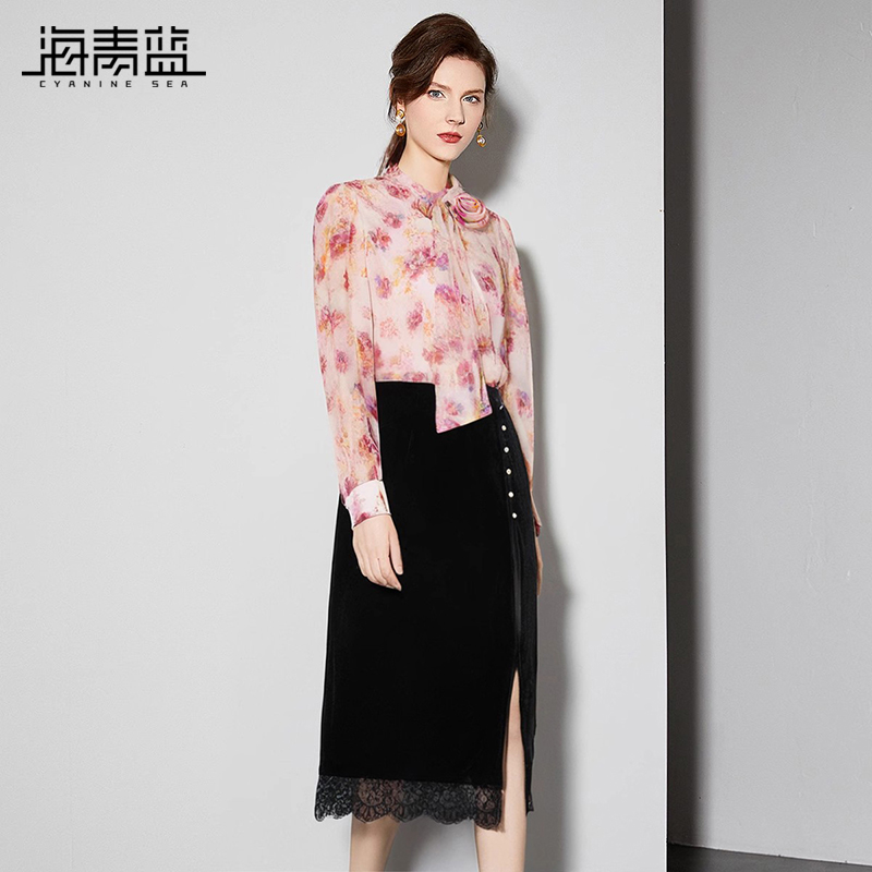 长袖 修身 印花衬衫 2025新款 包臀丝绒半身裙 早秋穿搭套装 海青蓝时尚