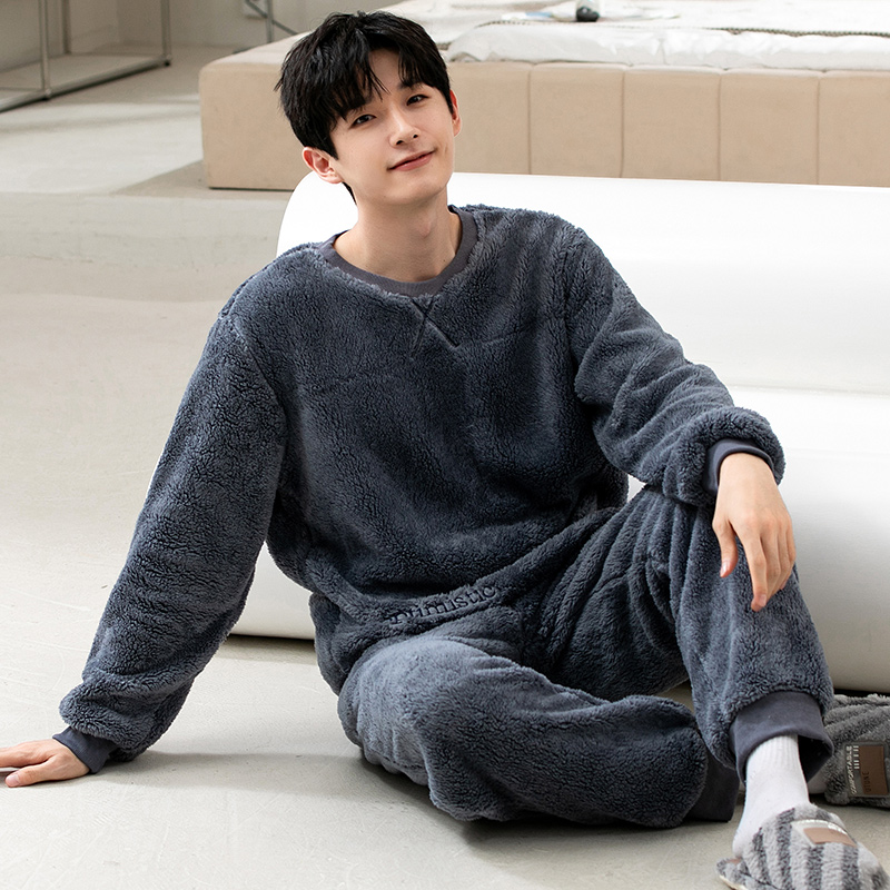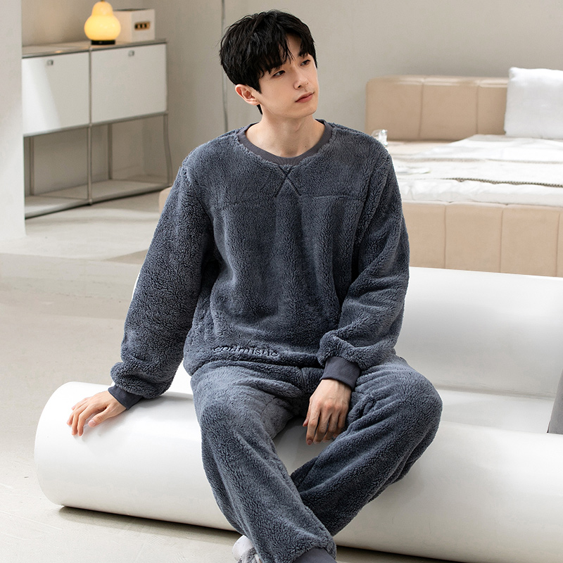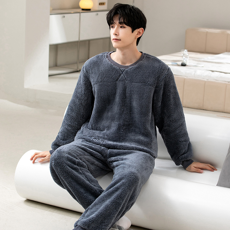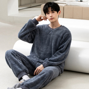 拉链珊瑚绒加绒可外穿情侣家居服女套装 睡衣秋冬男款 双层加厚