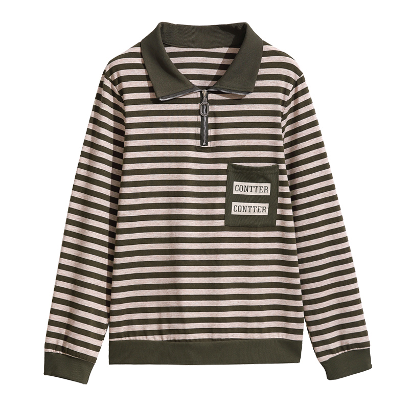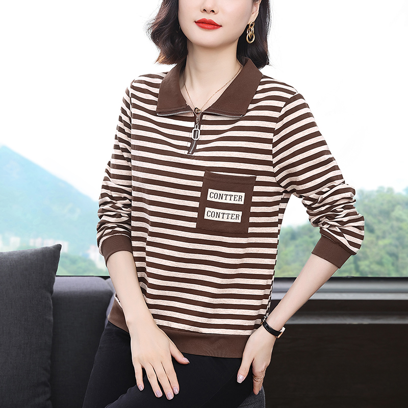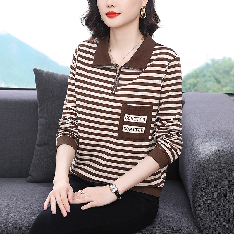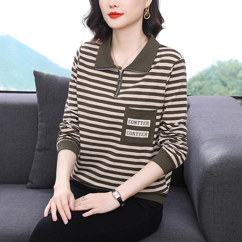 显瘦POLO上衣打底衫 T恤女士中老年大码 条纹翻领宽松长袖 妈妈春季