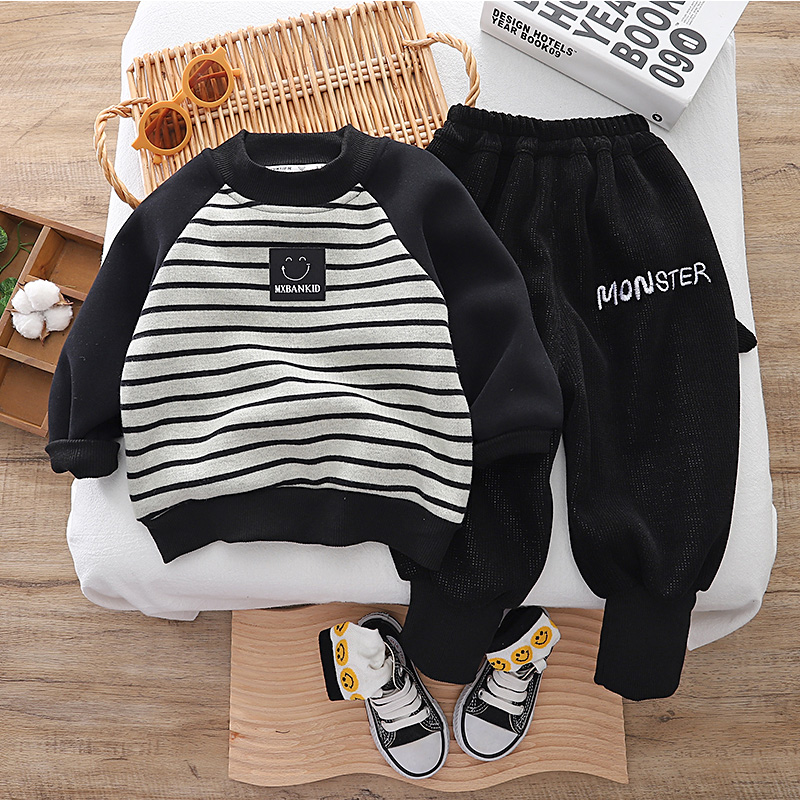 宝宝潮牌衣服儿童网红痞帅气加厚套装 男童加绒卫衣秋冬装 2023新款