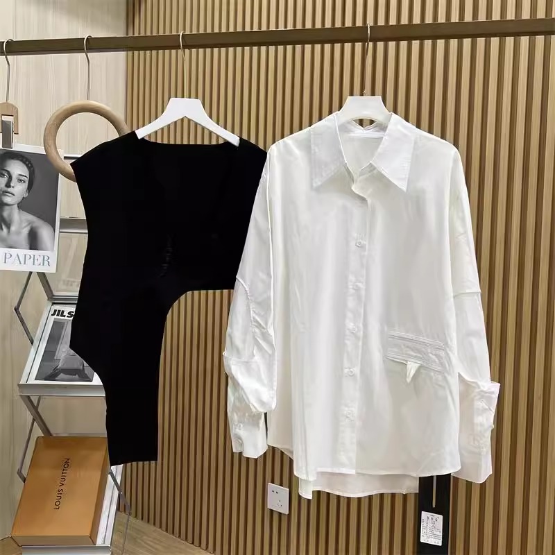 两件套装 男女春秋不规则马夹长袖 港风2 300斤欧货设计感衬衫 特大码
