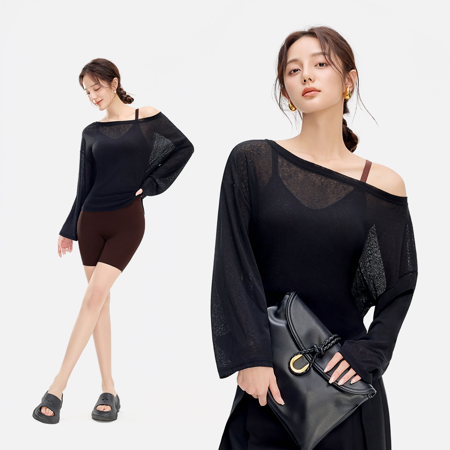 性感露透纯欲微透长袖 辣妹斜肩上衣女蝙蝠袖 t恤 罩衫 曲线主义薄款