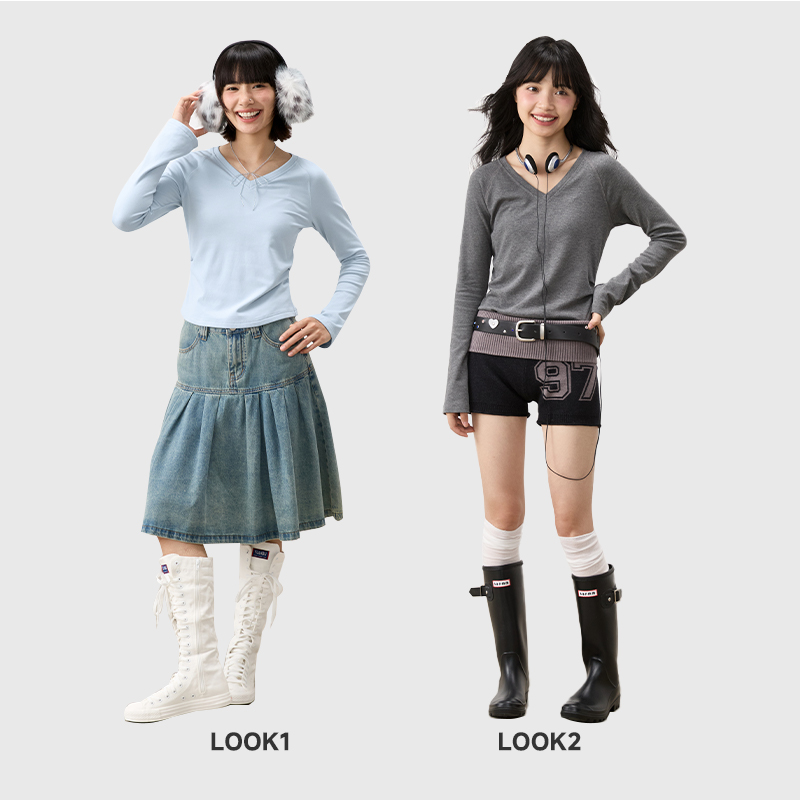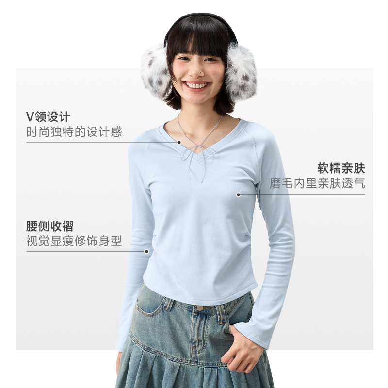 秋季 女2025新款 复古V领辣妹内搭上衣 t恤打底衫 ZH回力蓝色长袖