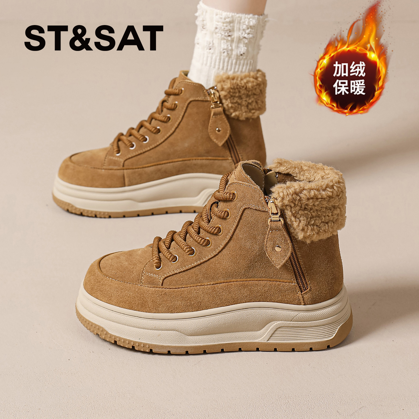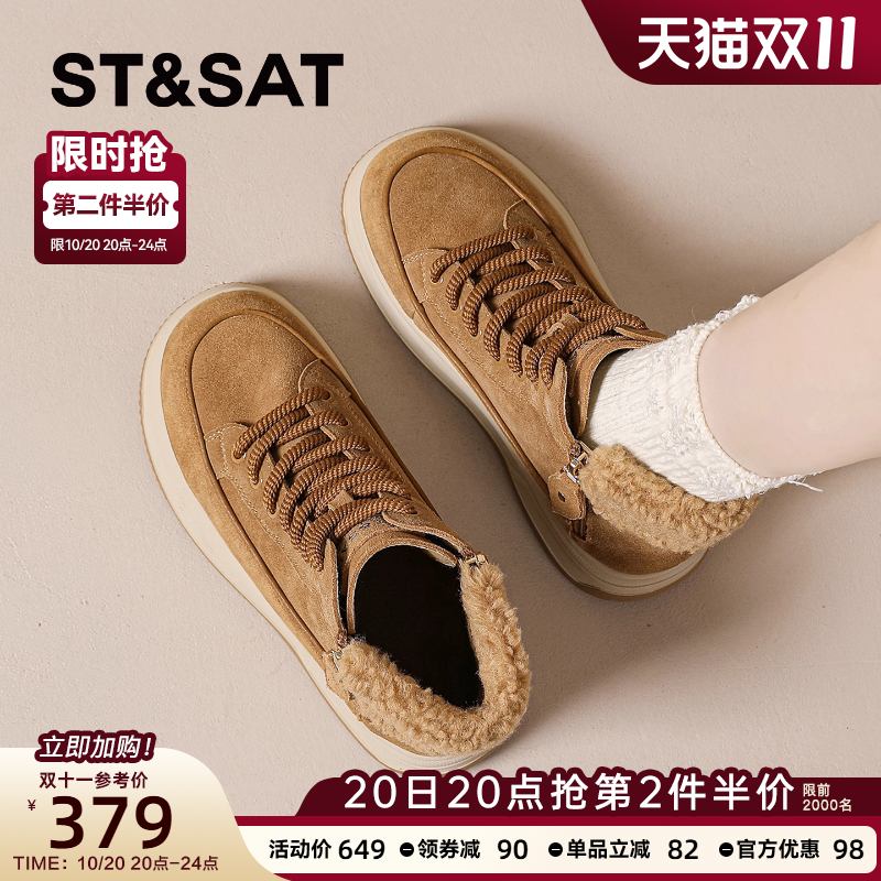 棕色短靴马丁靴 加绒加厚保暖棉鞋 星期六真皮雪地靴女2025新款 冬季