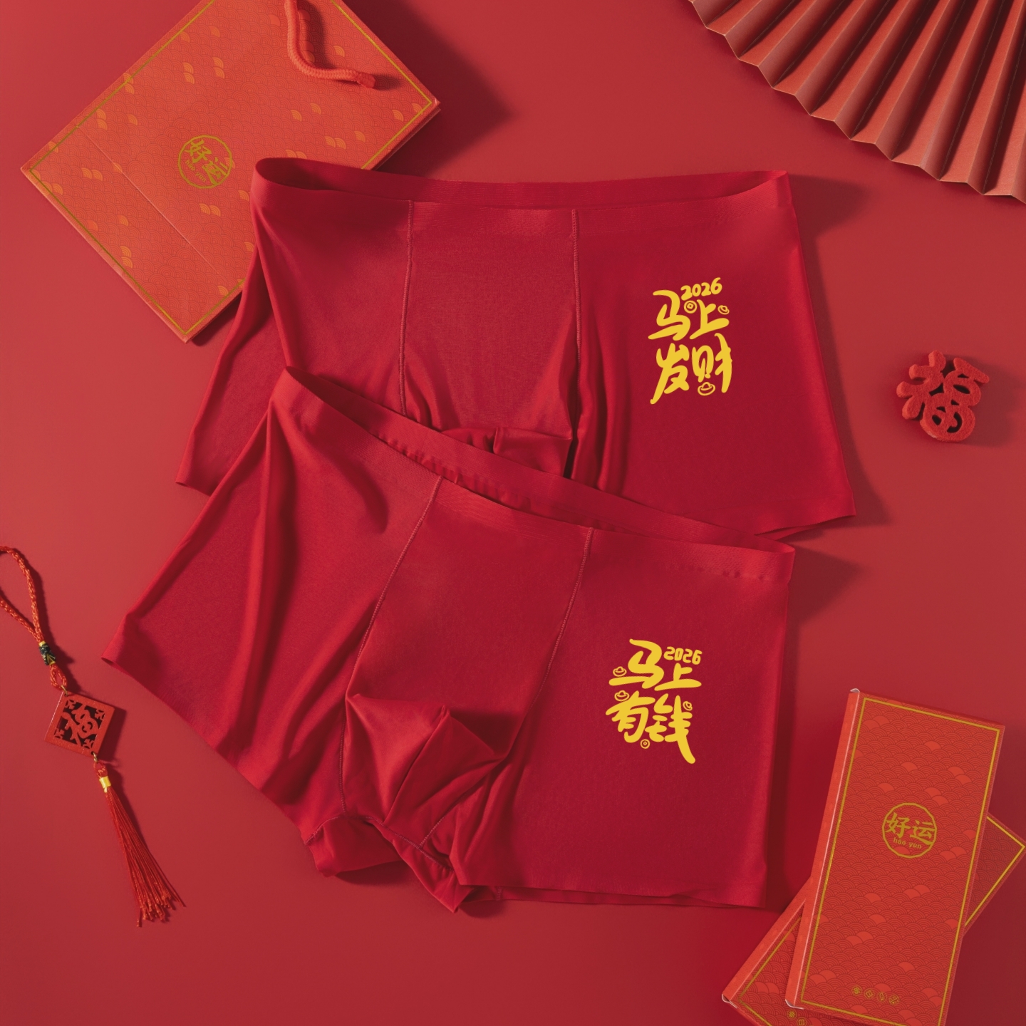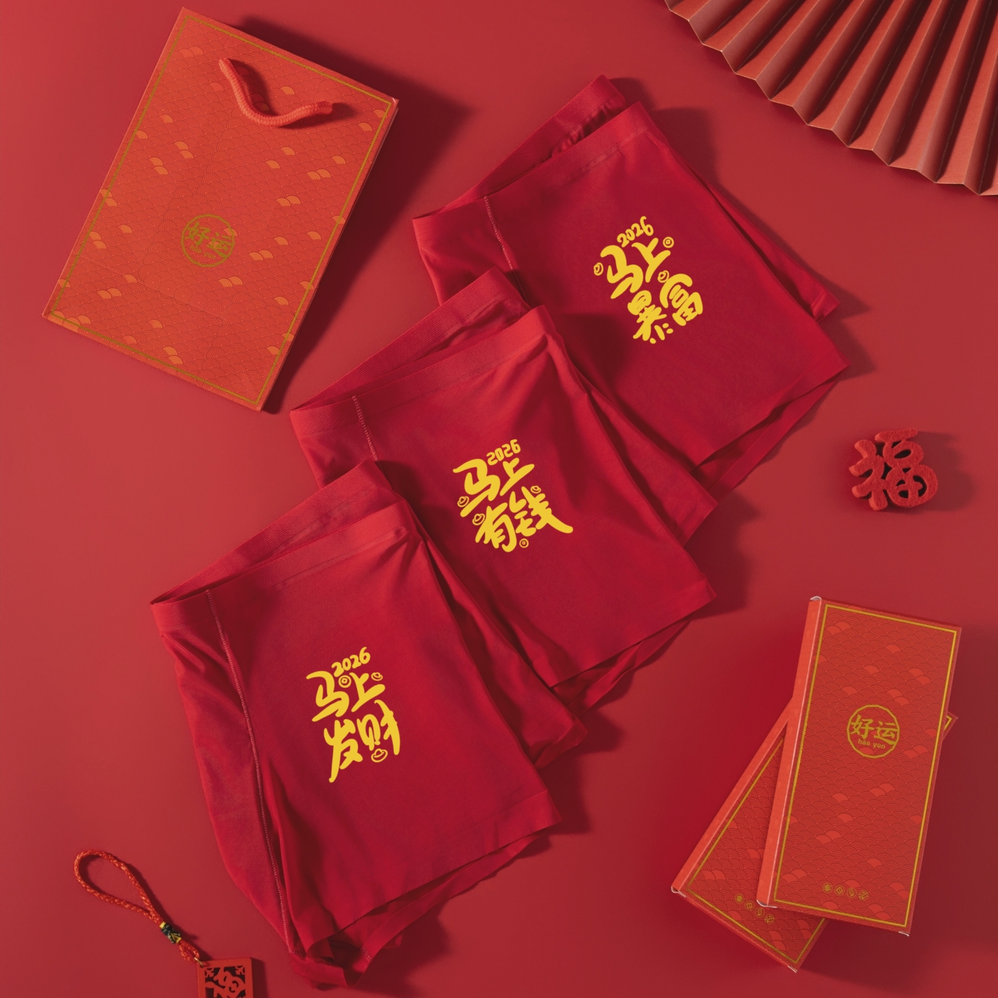 无痕男生四角属马平角裤 礼盒装 酒红色冰丝薄款 内裤 马年本命年男士