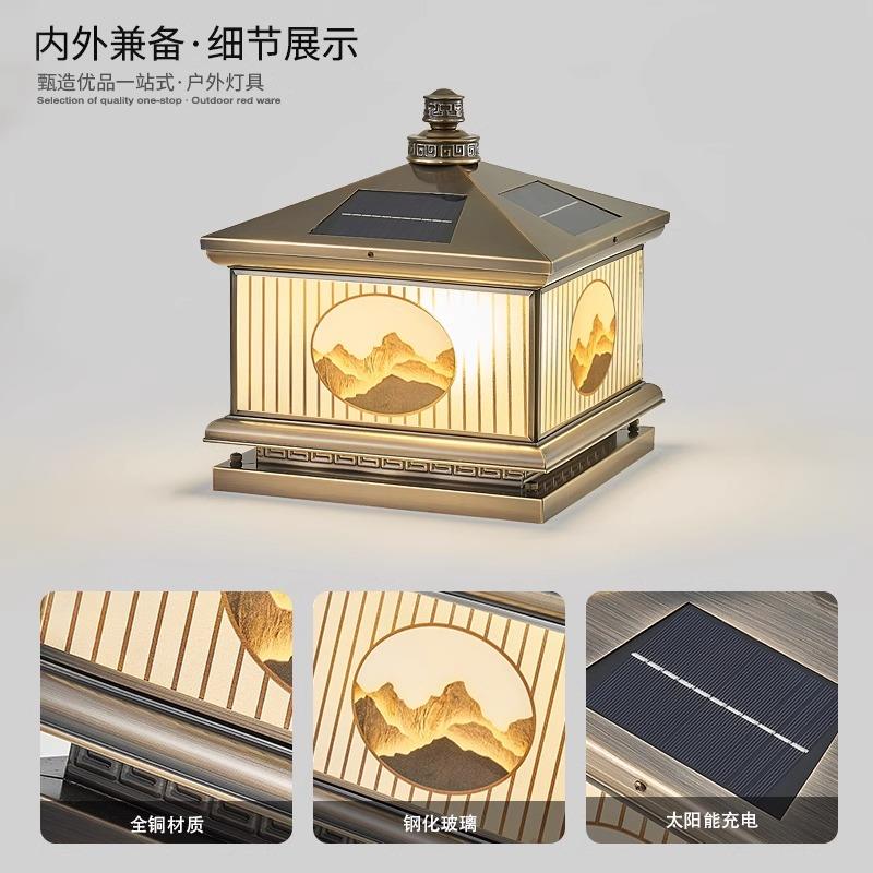 新中式 全铜柱头灯太阳能户外庭院别墅大门灯门柱灯柱子灯围墙两用