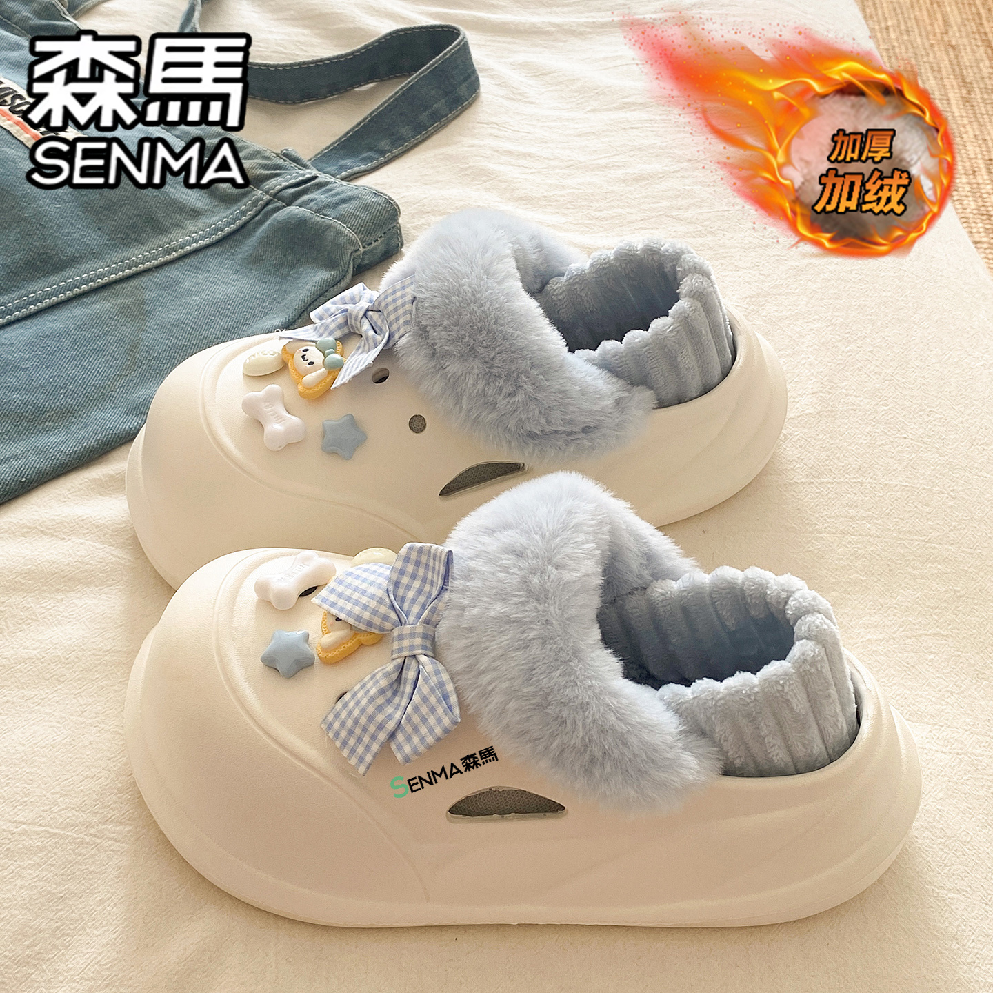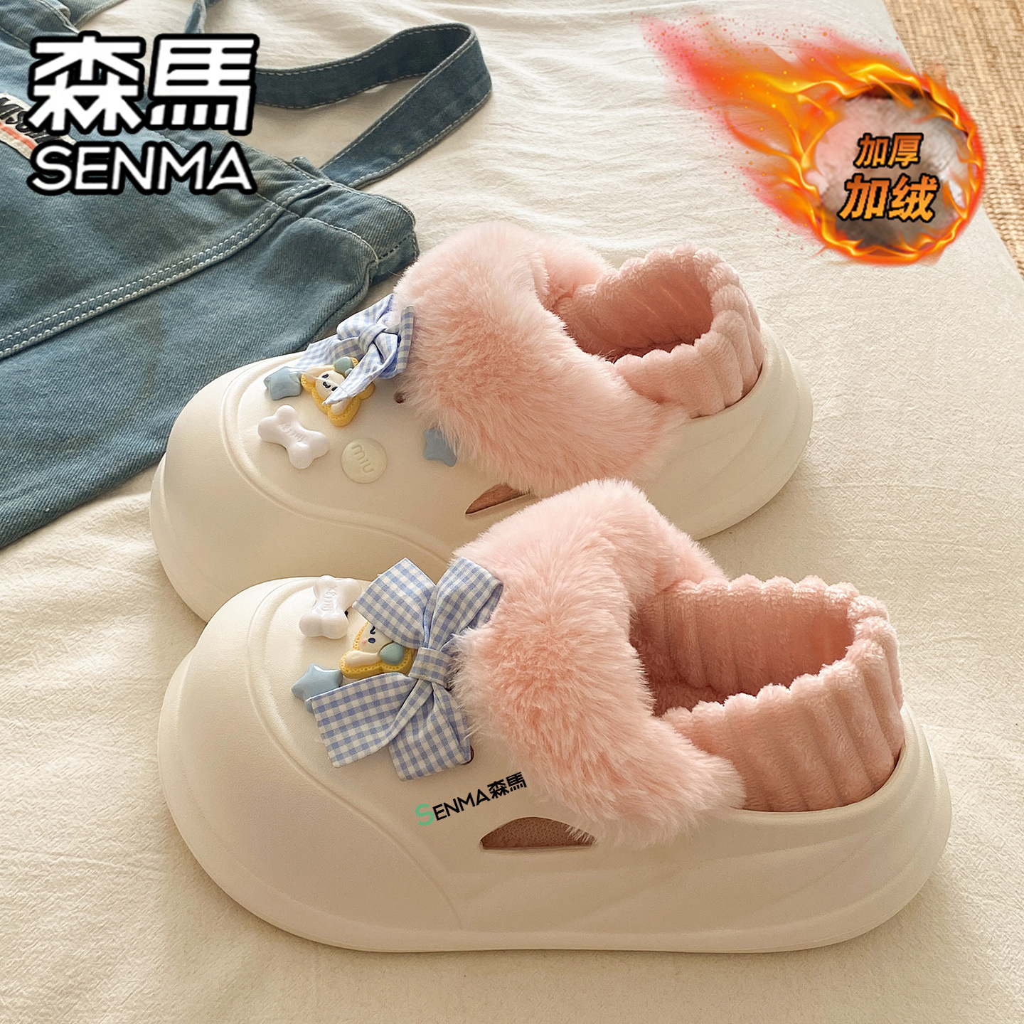 女生外穿厚底增高包头拖鞋 加绒加厚保暖包跟棉鞋 女冬季 森马棉拖鞋