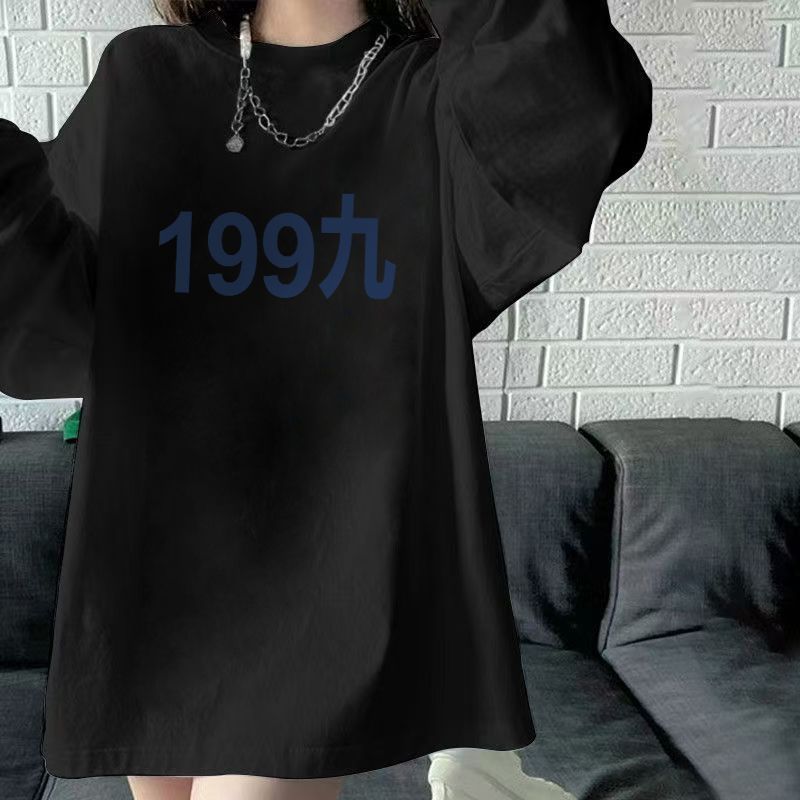 t恤女款 100%纯棉秋季 上衣潮牌百搭长袖 宽休闲风松显瘦中长款 新款