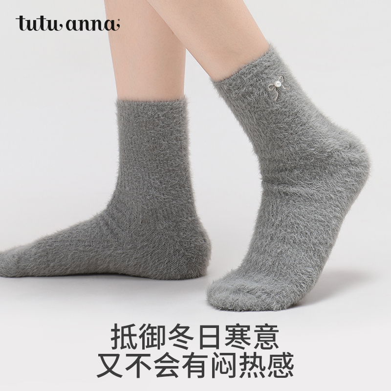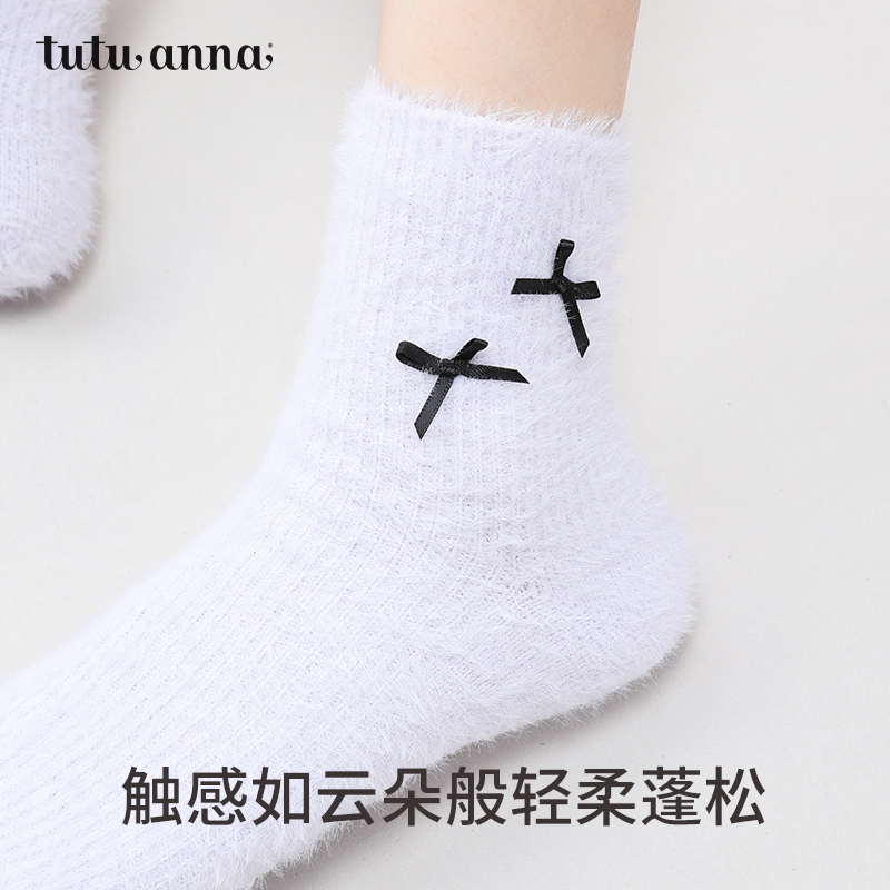 tutuanna秋冬中筒袜子女纯色加厚毛绒保暖蝴蝶结木耳边百搭短袜女