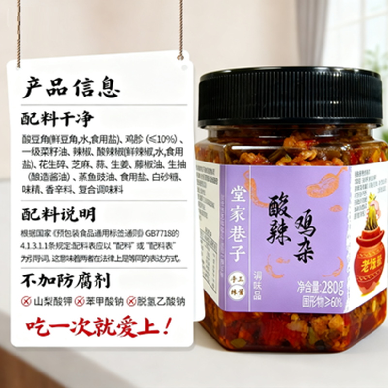堂家巷子酸辣鸡杂酸豆角湖南特产剁椒辣椒酱下饭菜香辣拌饭酱瓶装
