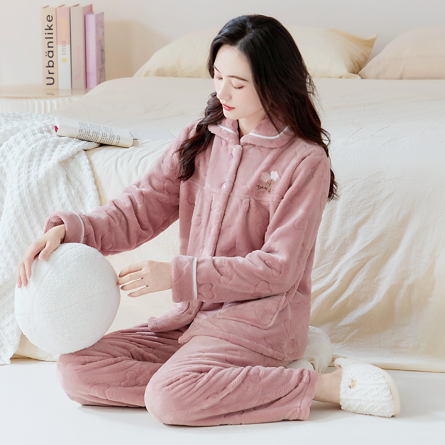 女款 秋冬季 开衫 加厚保暖珊瑚绒女士睡衣套装 冬天法兰绒家居服 长袖