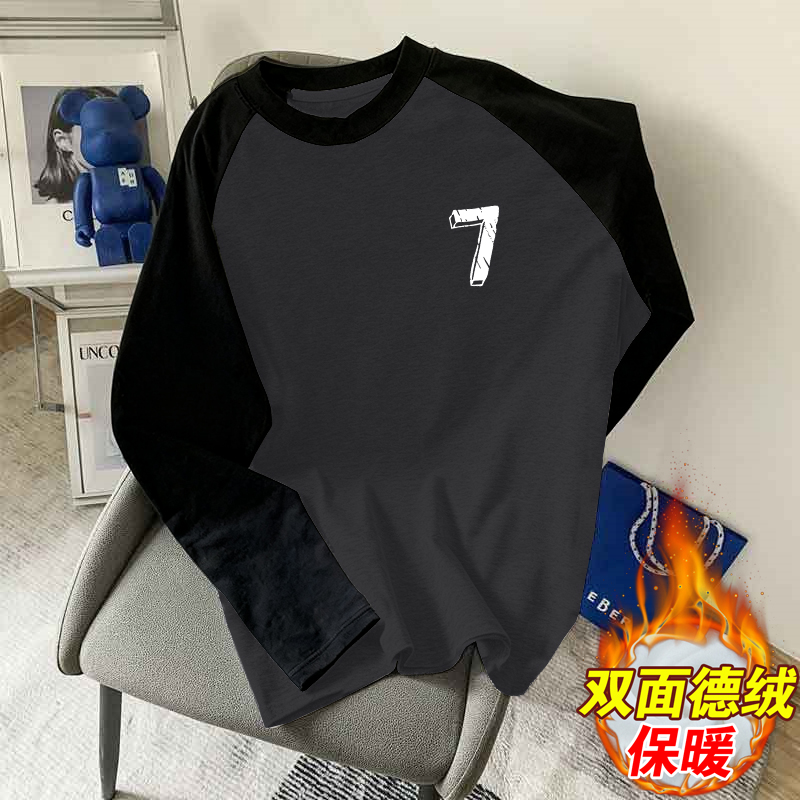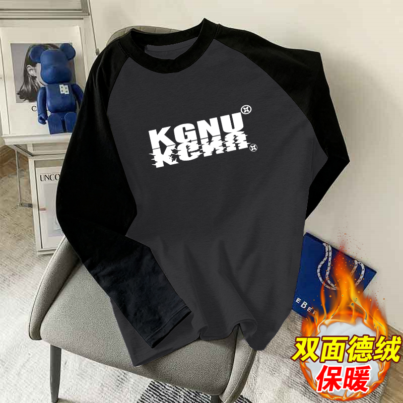 内搭加绒加厚长袖 秋冬款 t恤上衣 双面德绒撞色打底衫 保暖插肩男士