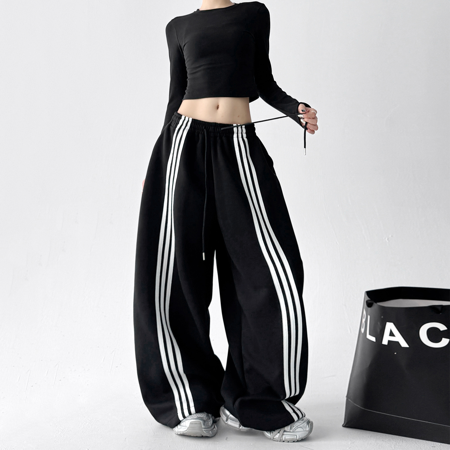 百搭宽松休闲哈伦裤 2025秋冬新款 子 女条纹拼接束脚运动裤 欧货卫裤