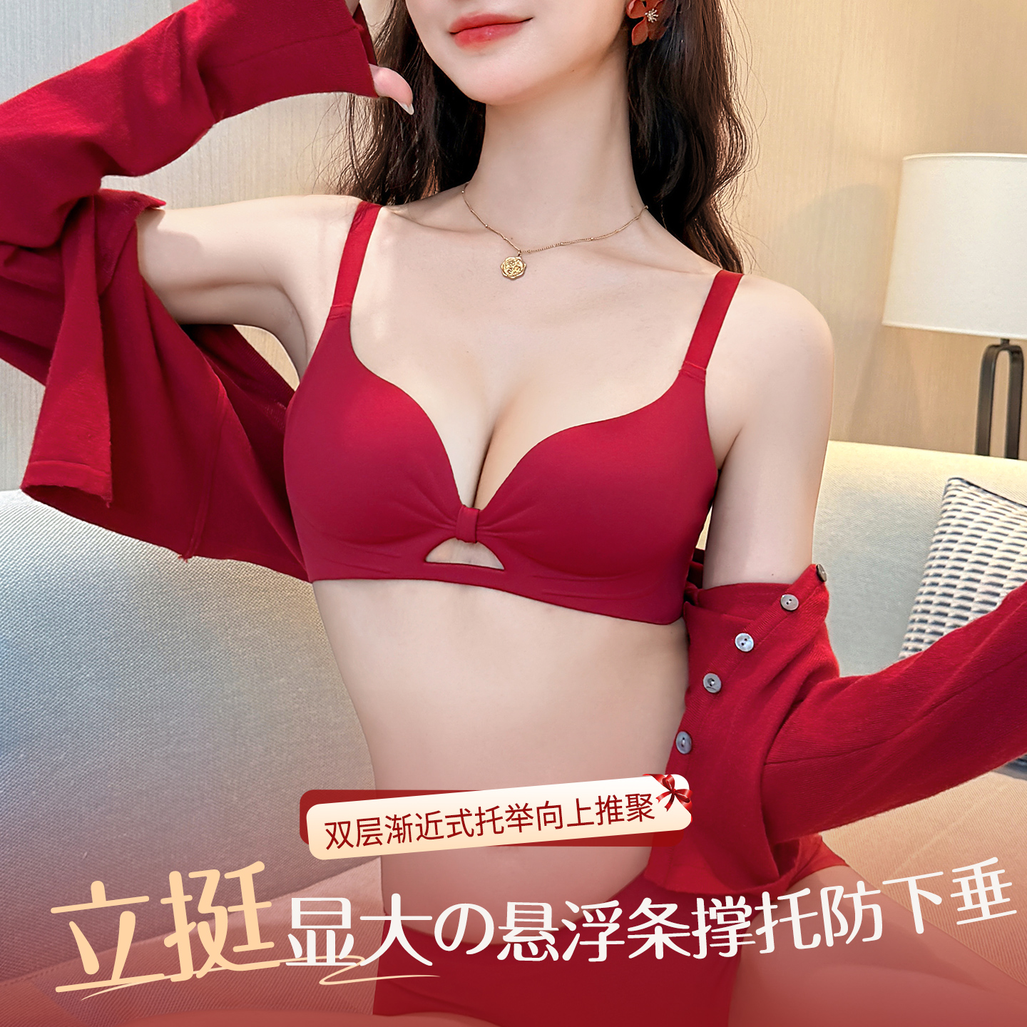 幸棉前扣内衣女小胸显大圆盘胸收副乳红色无痕防下垂文胸罩聚拢