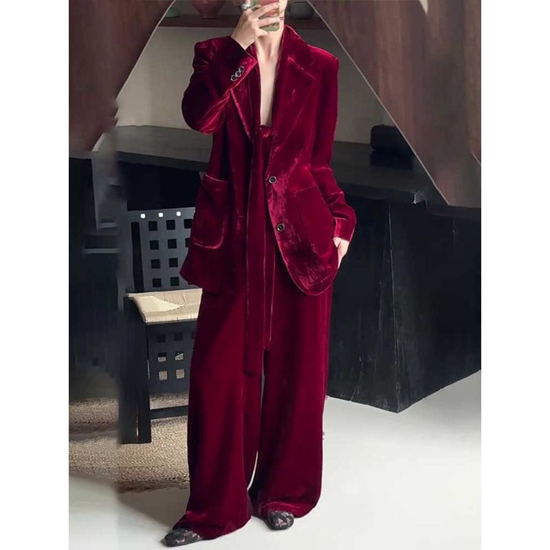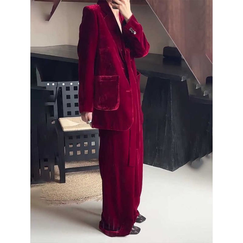 两件套 外套高级感显瘦气质阔腿裤 休闲秋冬新款 轻熟风红色丝绒西装