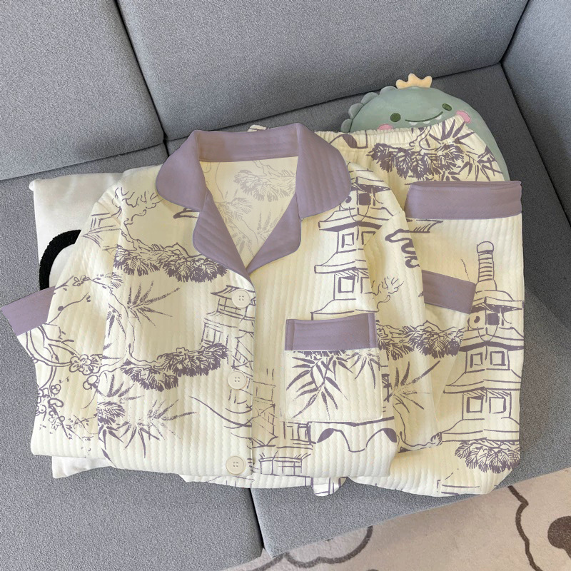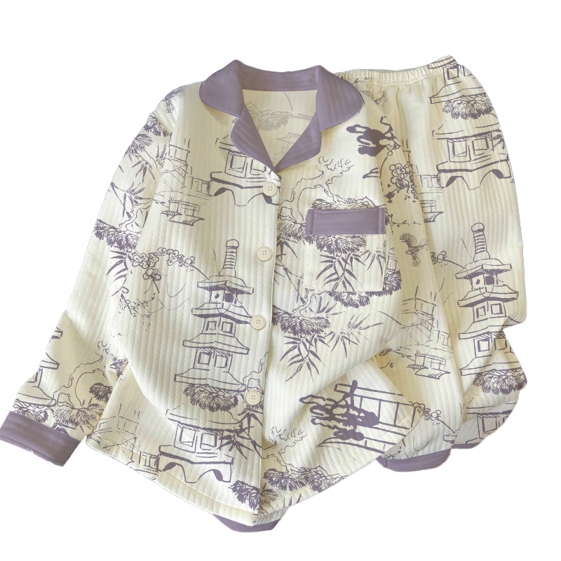 中老年妈妈文艺风家居服套装 新中式 高档秋冬空气棉睡衣女长袖