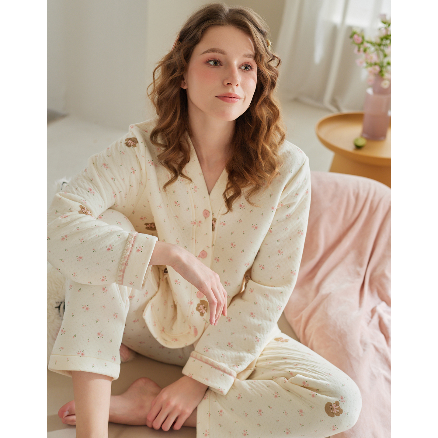 女士抗菌大码 套装 冬天家居服 长袖 芬腾女睡衣空气棉夹层纯棉秋冬季