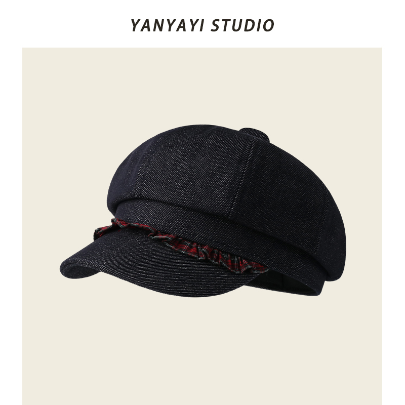 韩版 鸭舌帽 格子花边牛仔八角帽子女春秋复古百搭显脸小画家帽新款