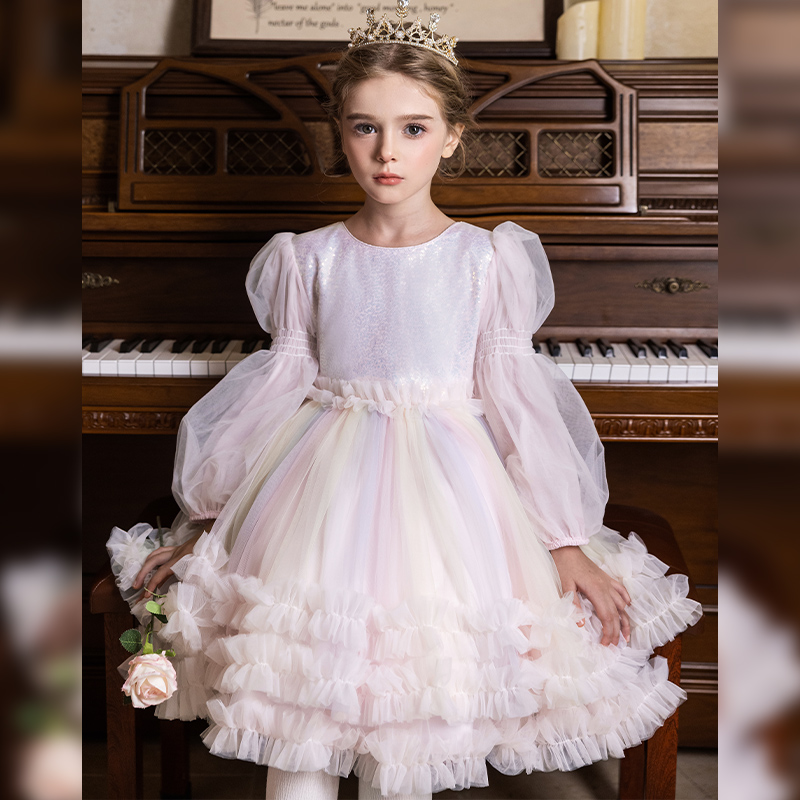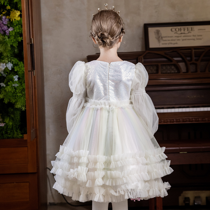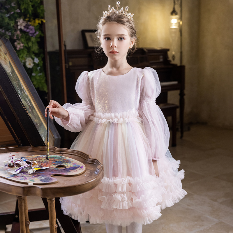 女童春秋连衣裙儿童蓬蓬纱裙女孩花童婚礼礼服彩虹绝美生日公主裙