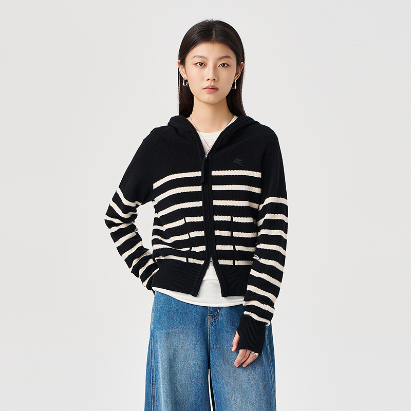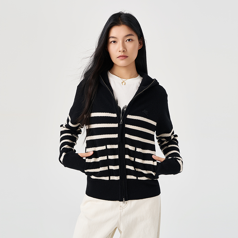 商场同款 女装 2025冬季 宽松条纹戴帽拉链绵羊毛织开衫 新品 OTT
