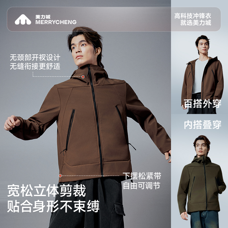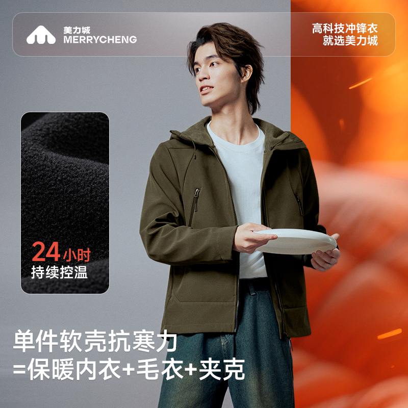 美力城柔壳经典 休闲连帽户外冲锋衣 复合绒软壳外套男2025秋冬新款