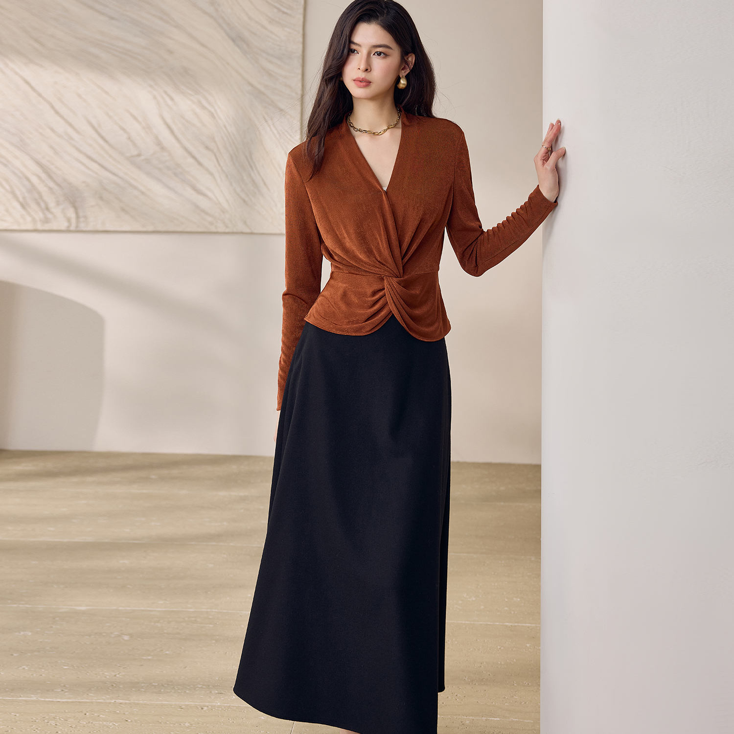 0192 a字裙休闲长裙子 美拉德山茶花褶皱百褶裙半身裙春秋女中长款