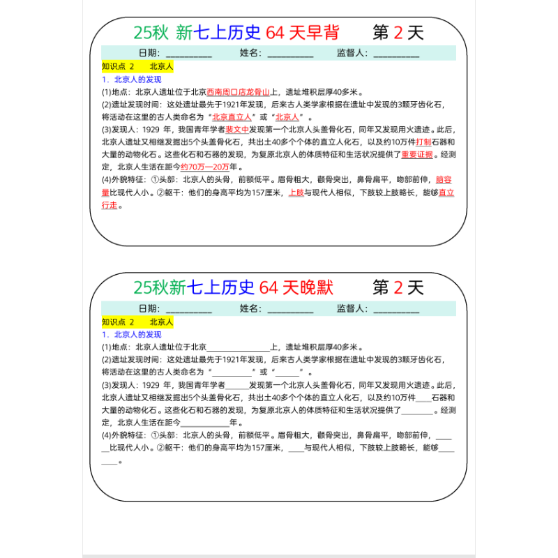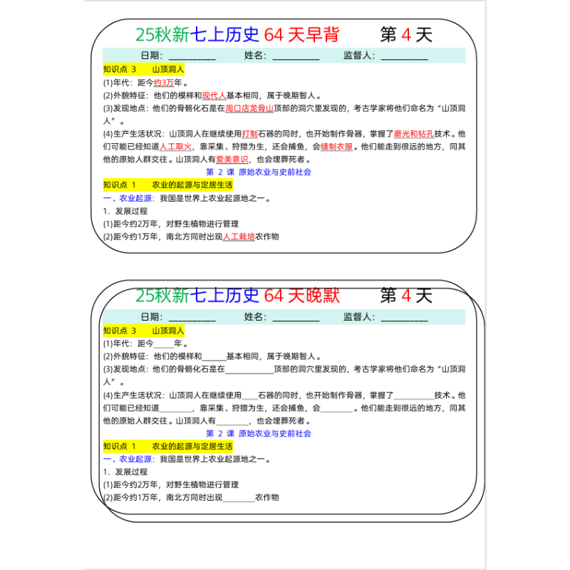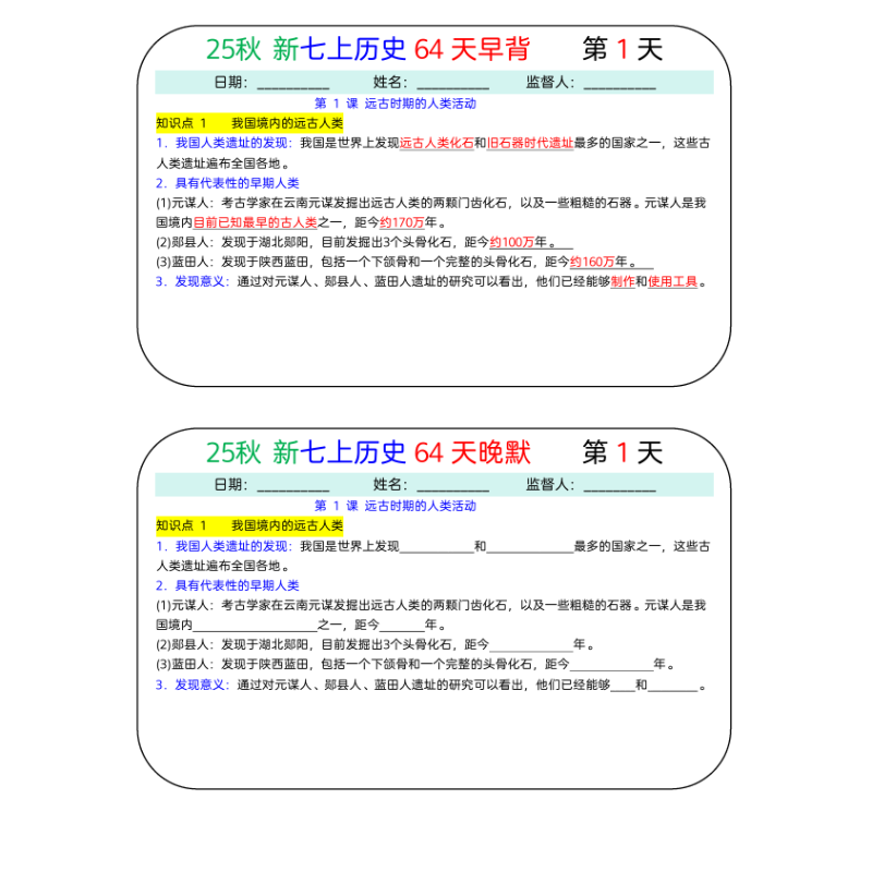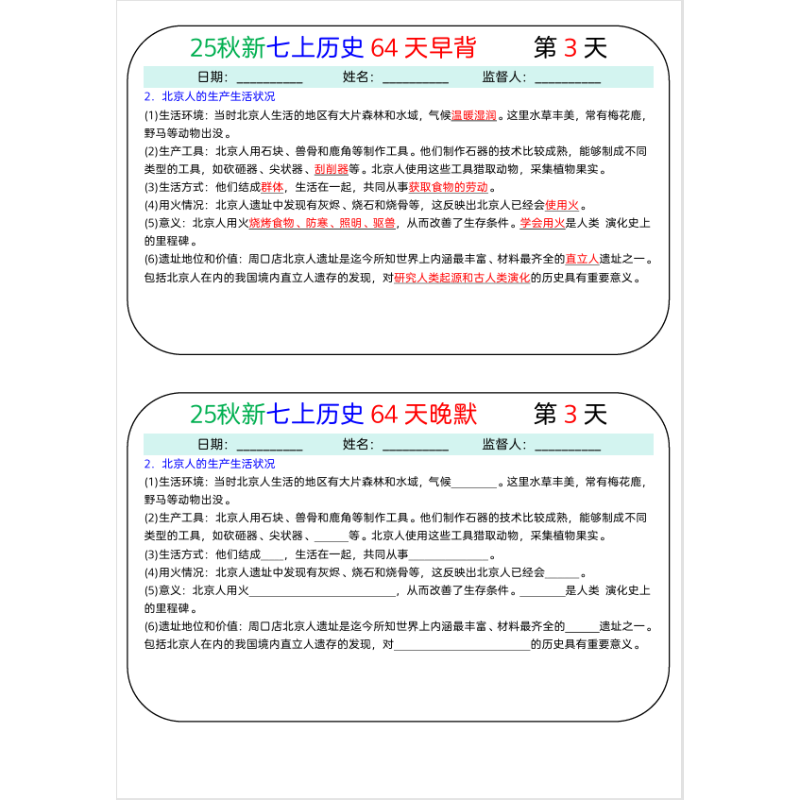 25秋新七年级上册历史早背晚默64天背诵版 历史重点知识早背诵晚默写期中期末复习历史早读晚默课内重点每日打卡