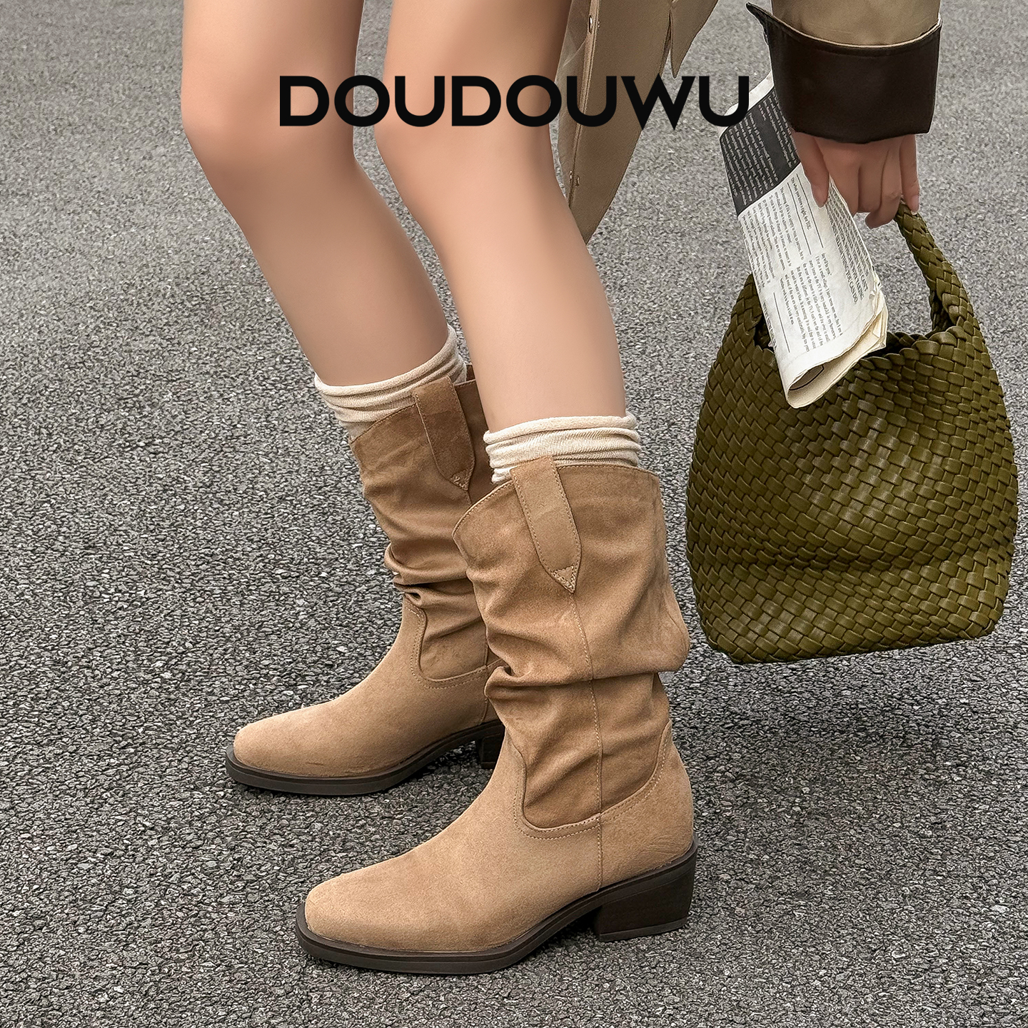 韩版 新款 潮休闲粗跟一脚蹬百搭中跟女靴 2025秋季 豆豆屋高筒靴女鞋