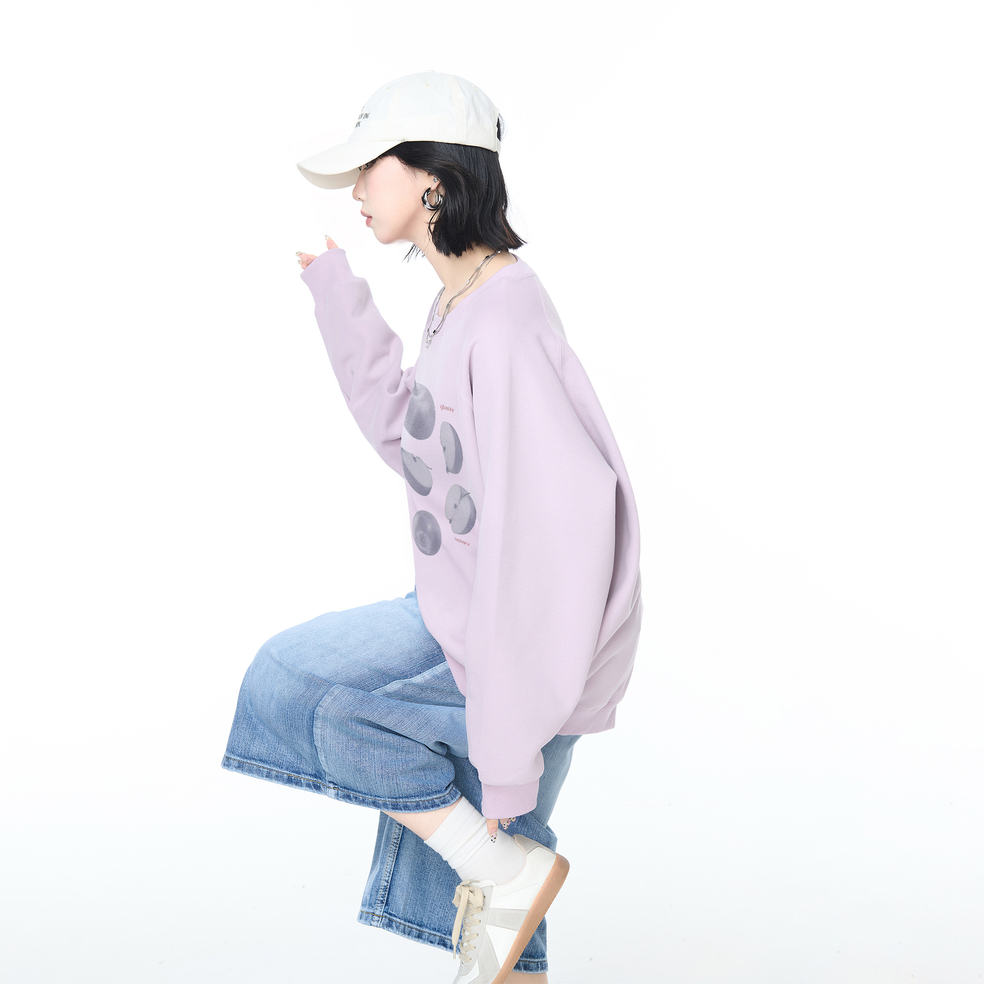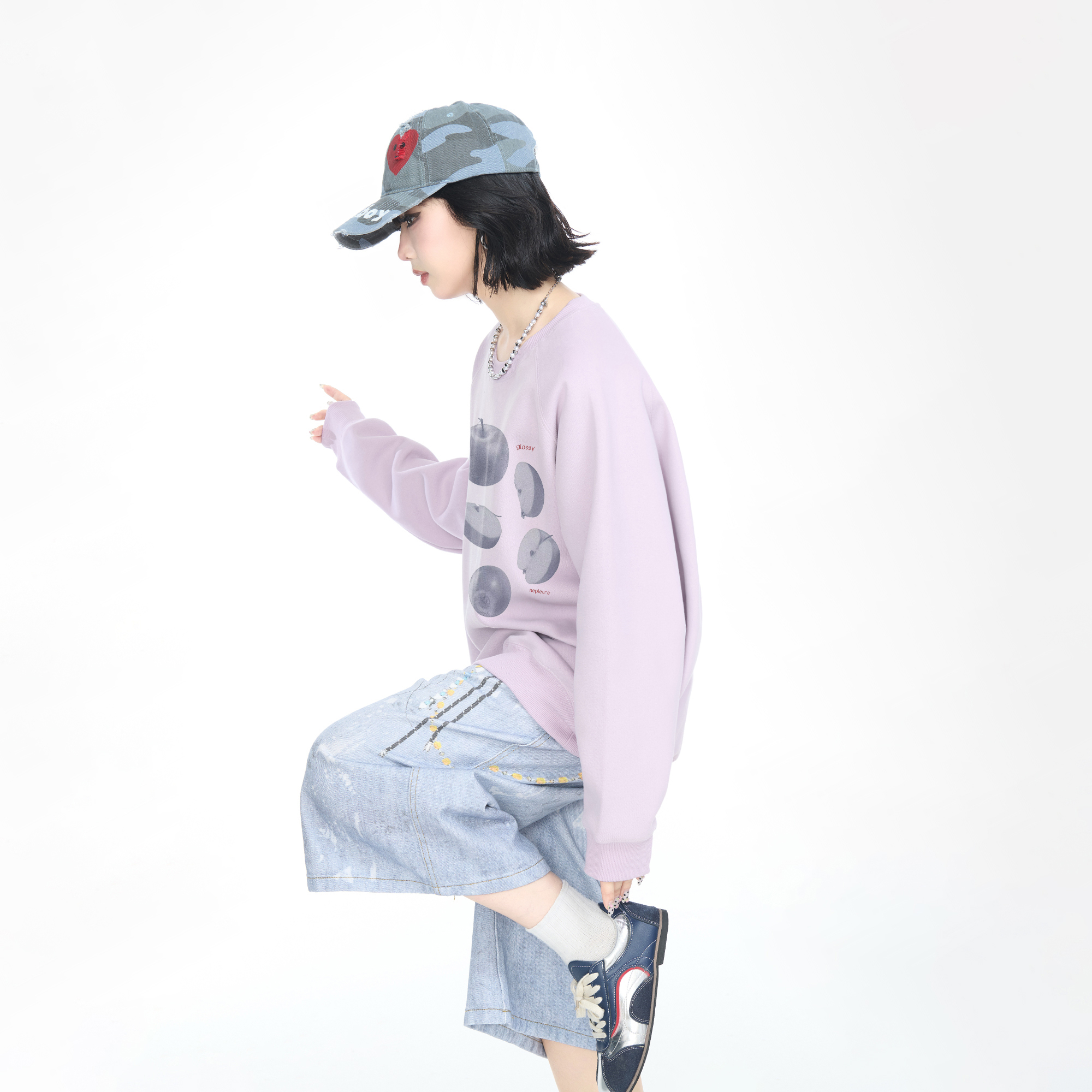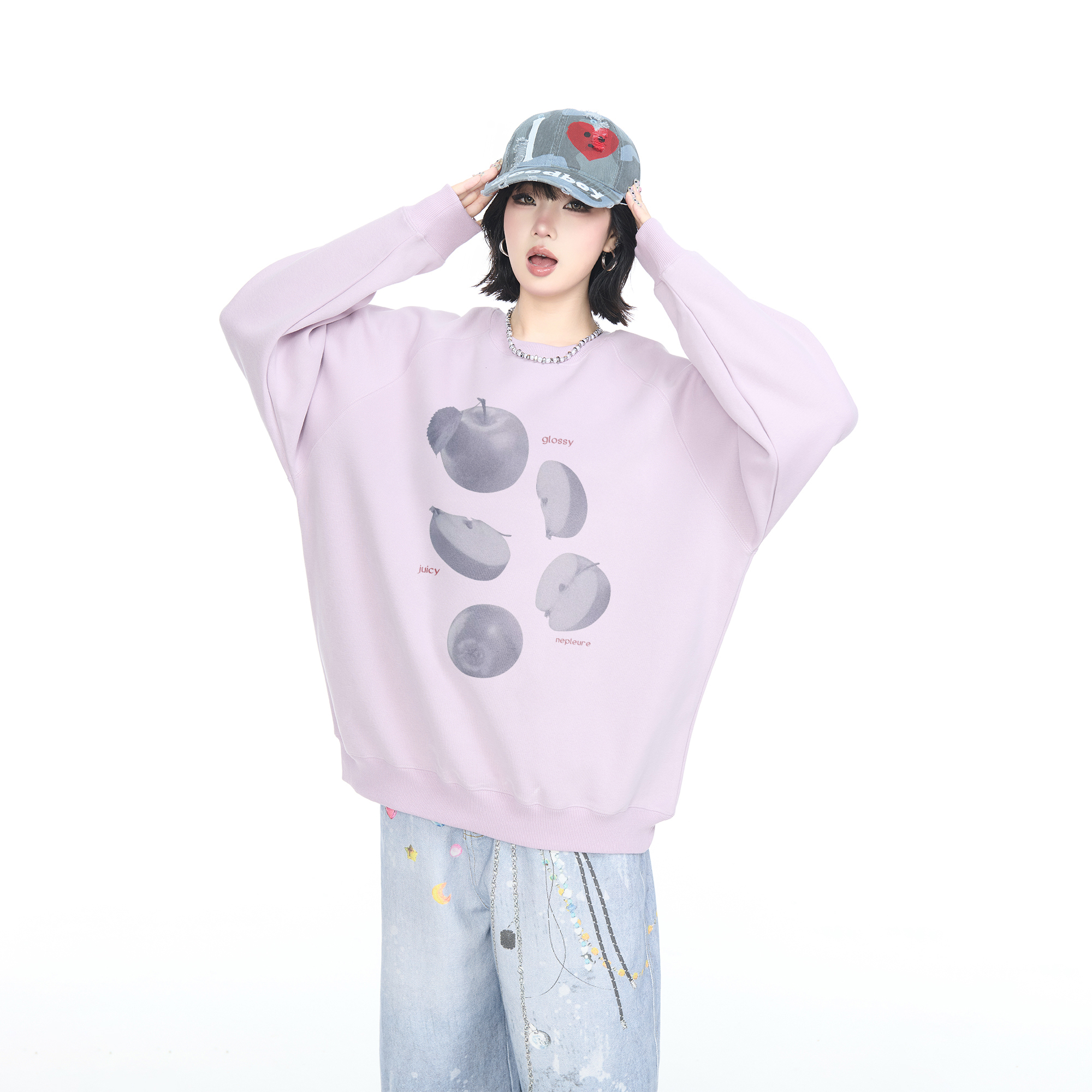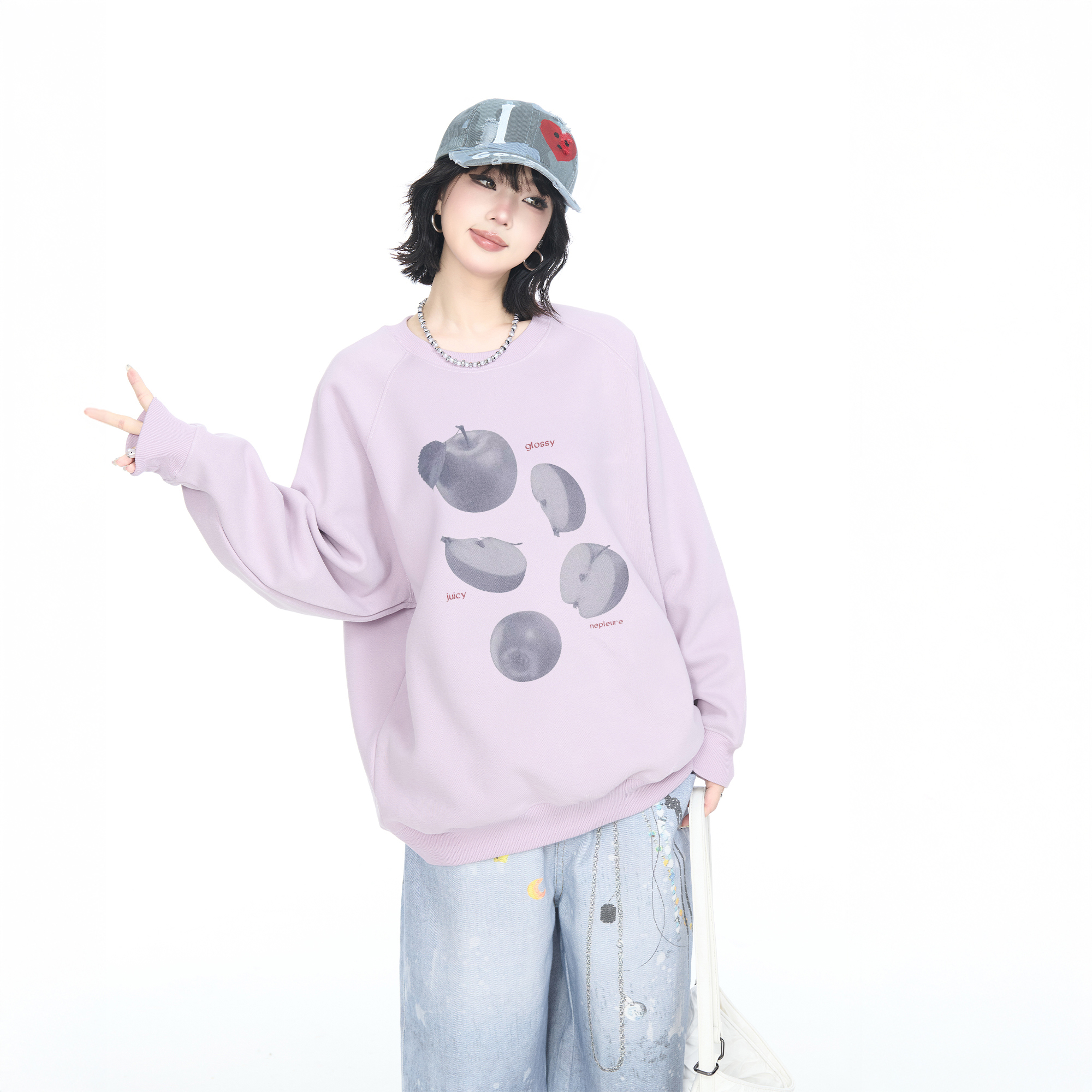 YEP春秋新款 街头套头上衣 浅紫色苹果印花圆领卫衣女宽松外套美式