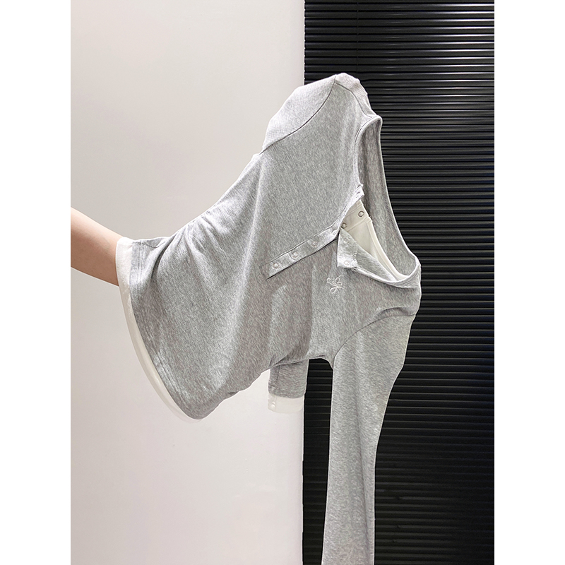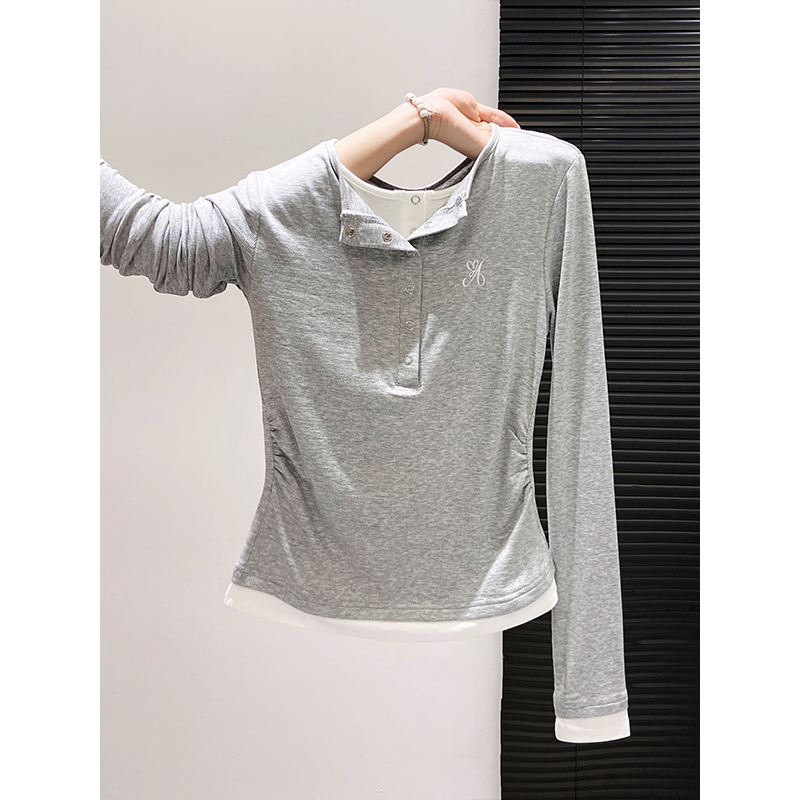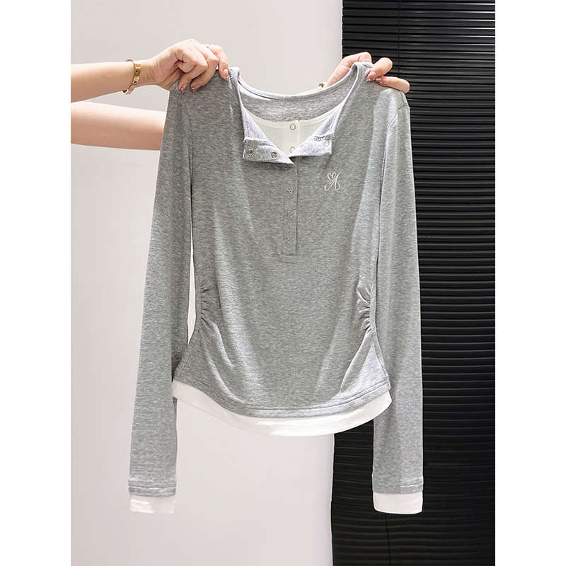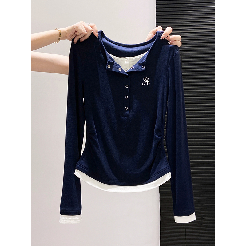 显瘦内搭打底衫 修身 小上衣 t恤女2025早秋新款 撞色假两件刺绣长袖