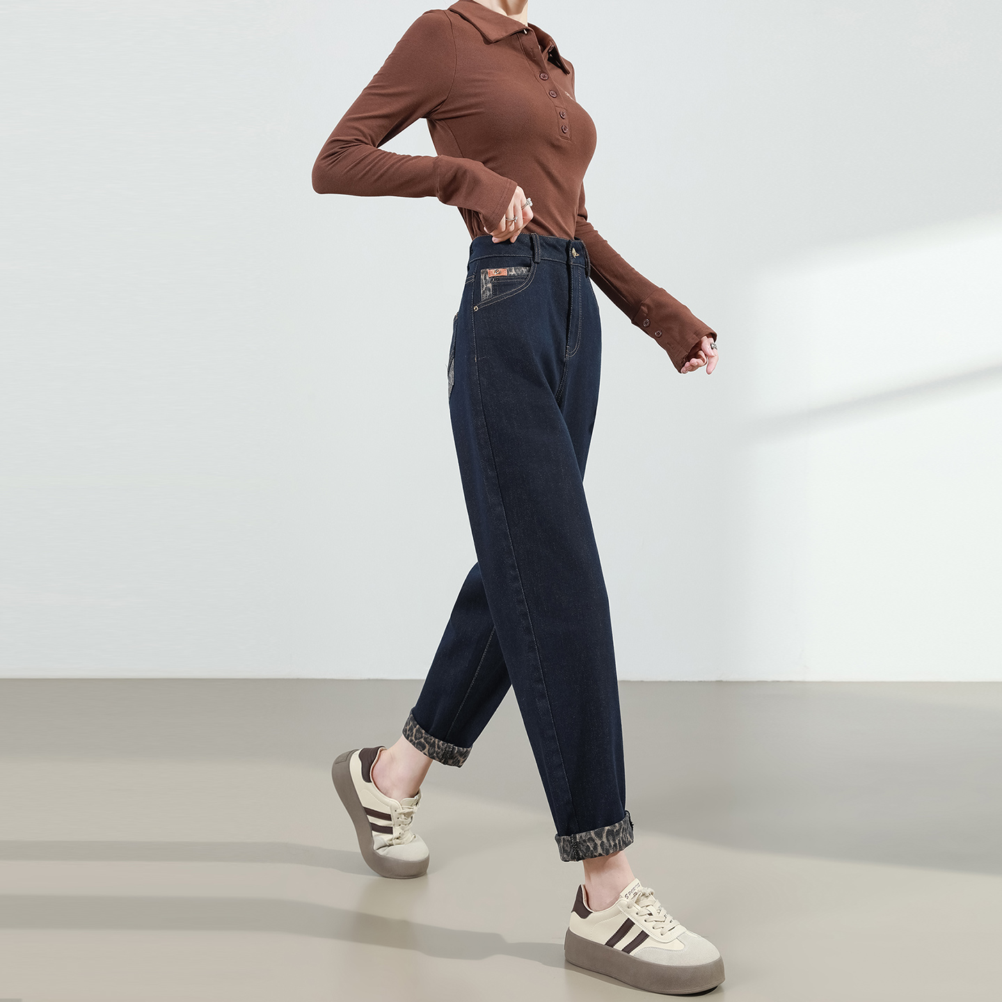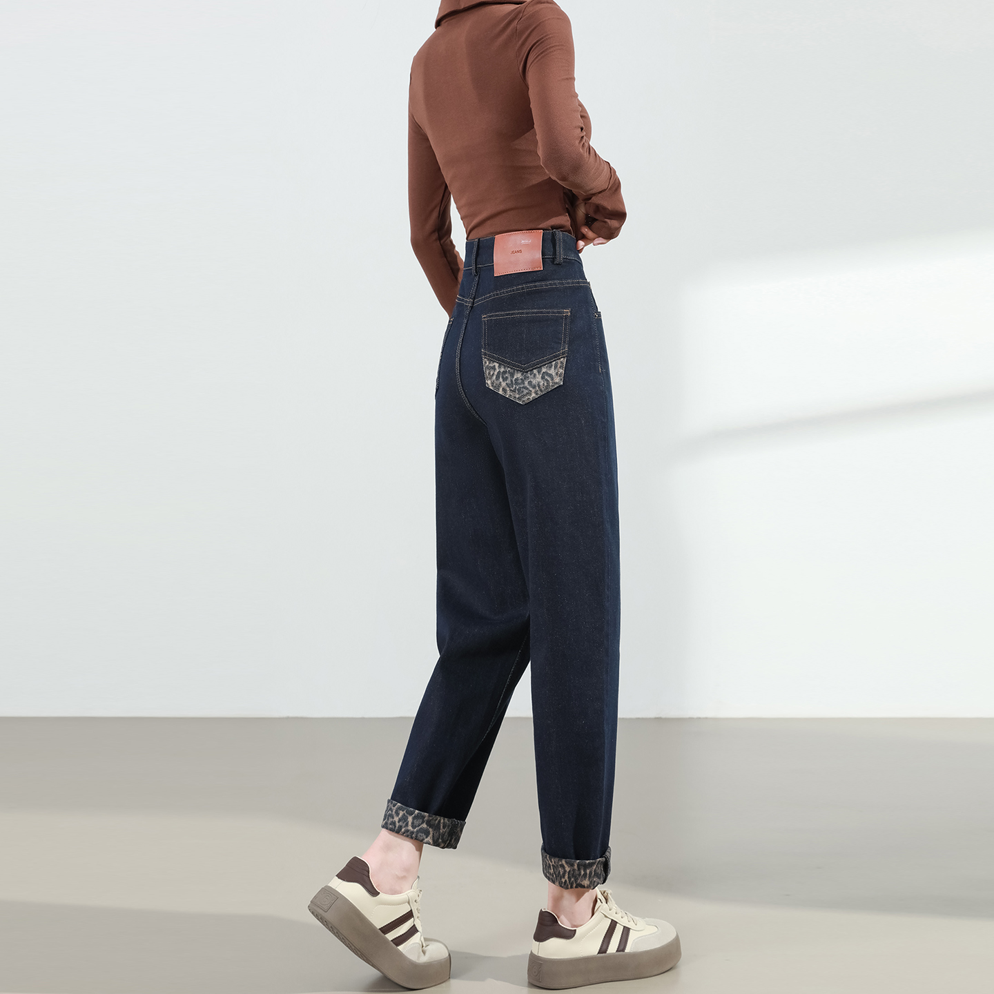 高腰显瘦小个子九分豹纹萝卜老爹裤 加绒卷边哈伦牛仔裤 女秋冬新款