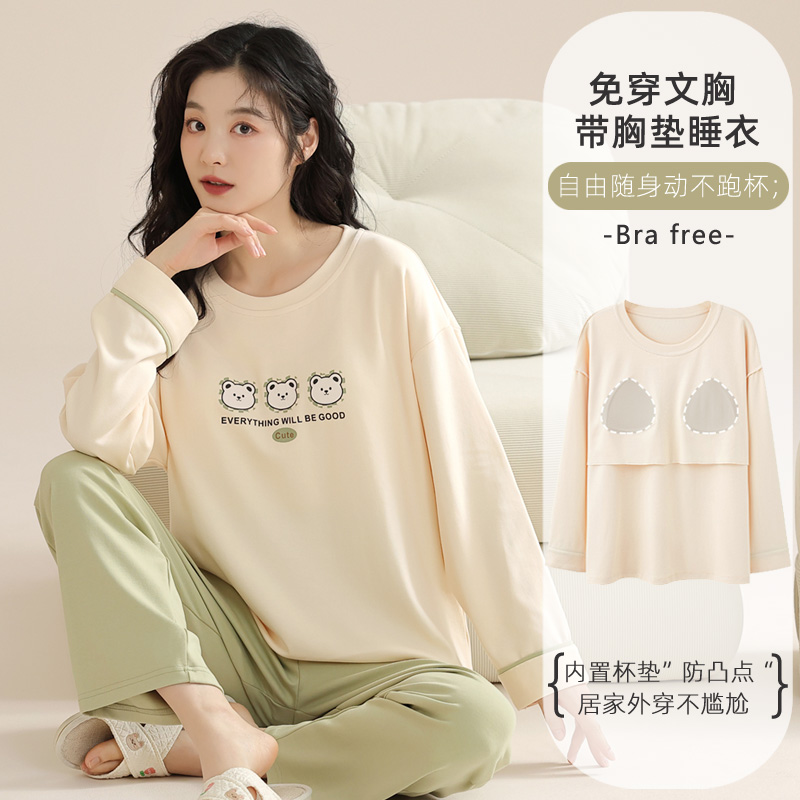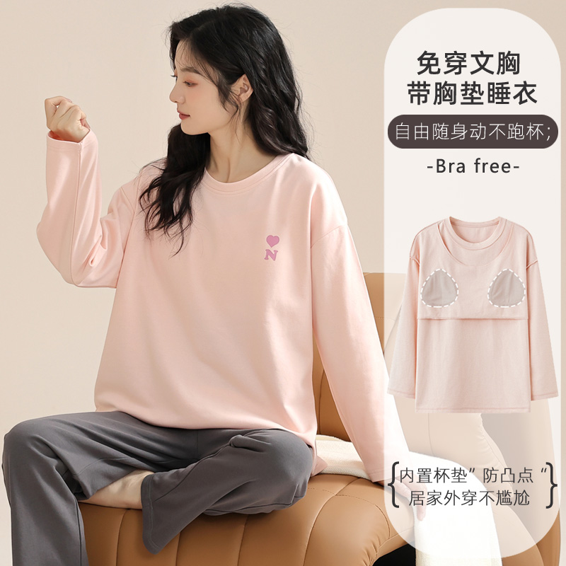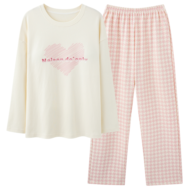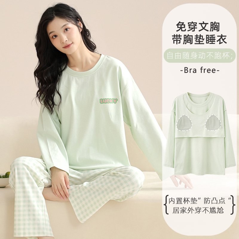 长袖 2025新款 春秋季 千鸟格长裤 甜美可爱带胸垫家居服 纯棉睡衣女款