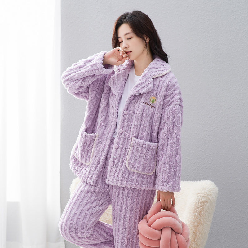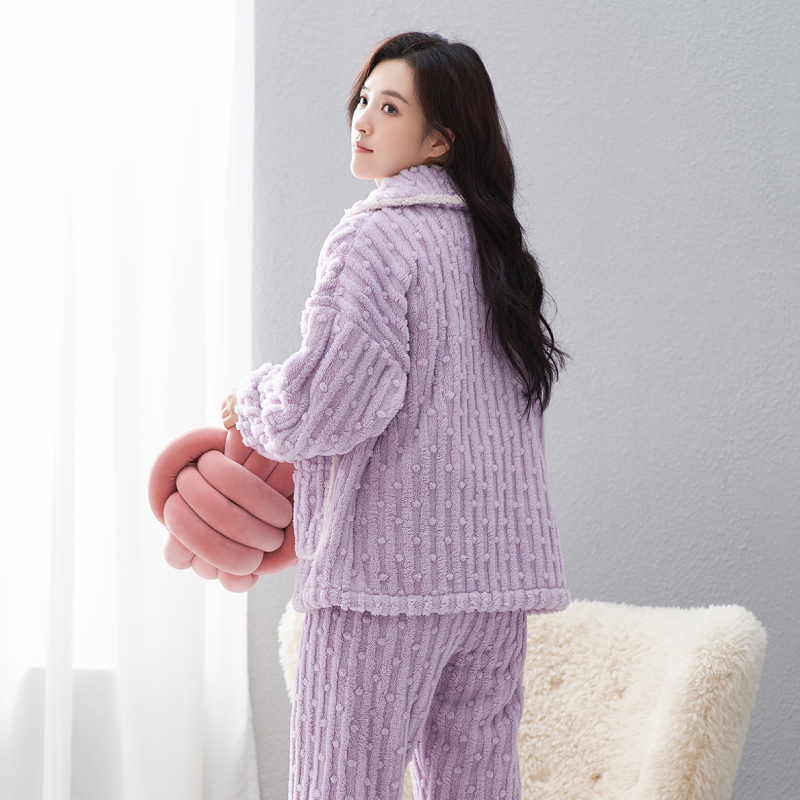 芬腾珊瑚绒睡衣女秋冬加绒加厚保暖提花条纹翻领可外穿家居服套装