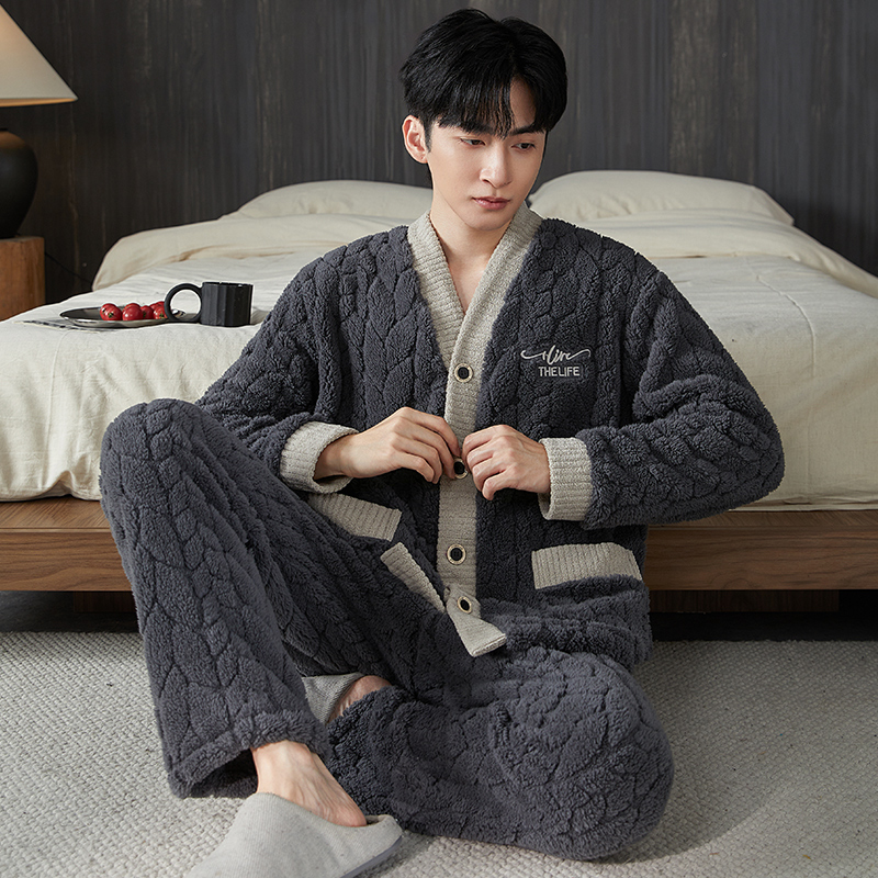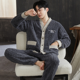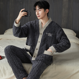睡衣保暖家居服套装 三层夹棉袄男士 可外穿 珊瑚绒加厚加绒款 秋冬季