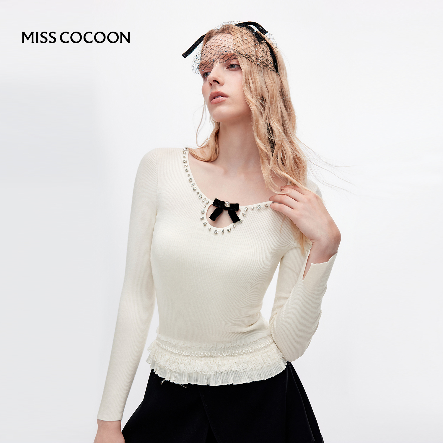 大U领羊毛打底衫 修身 女2025秋冬新款 MISSCOCOON可可尼白色针织衫