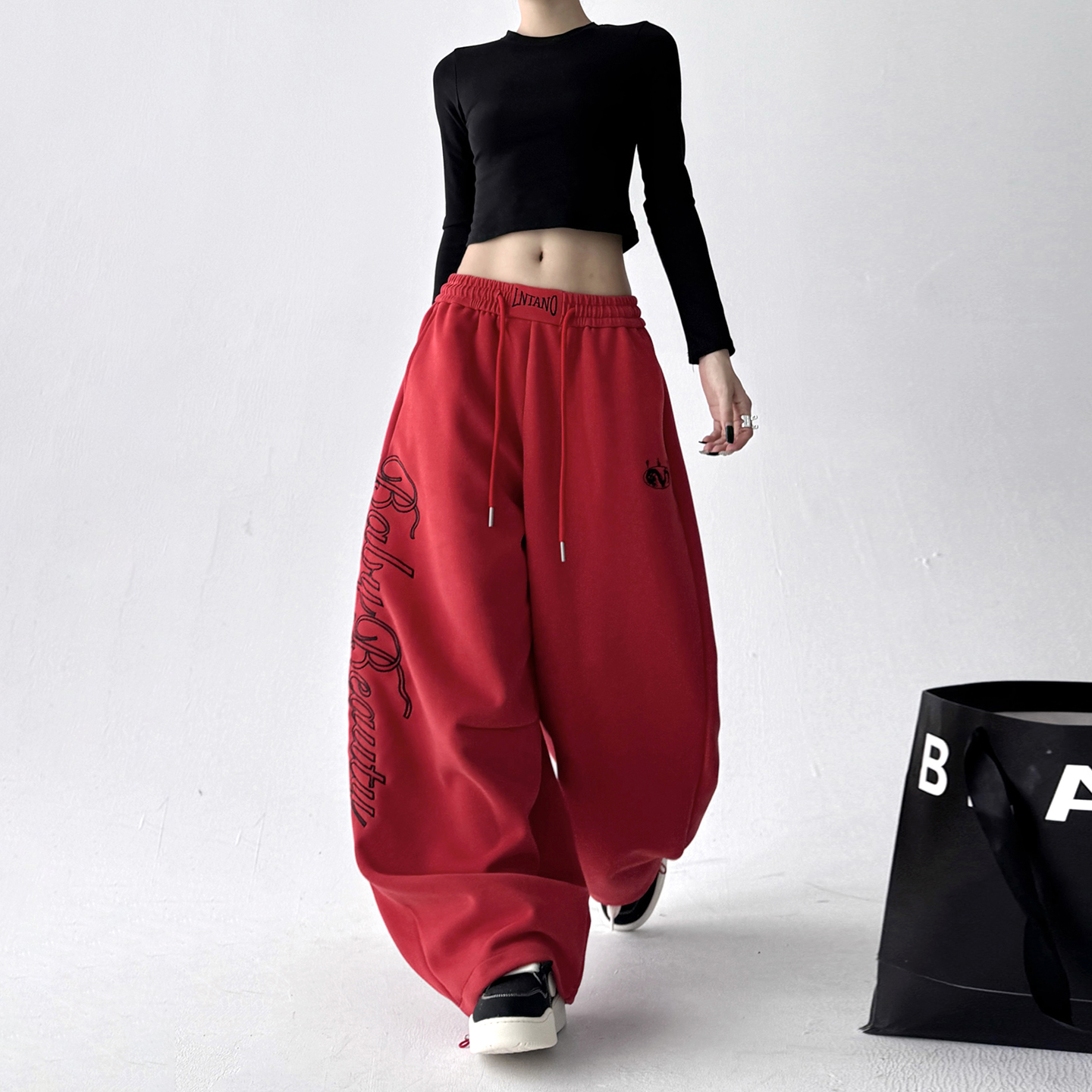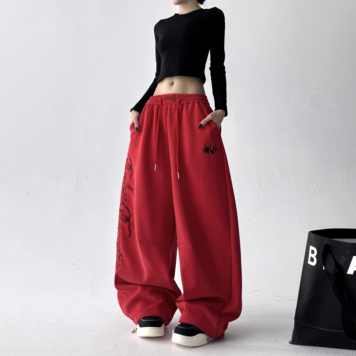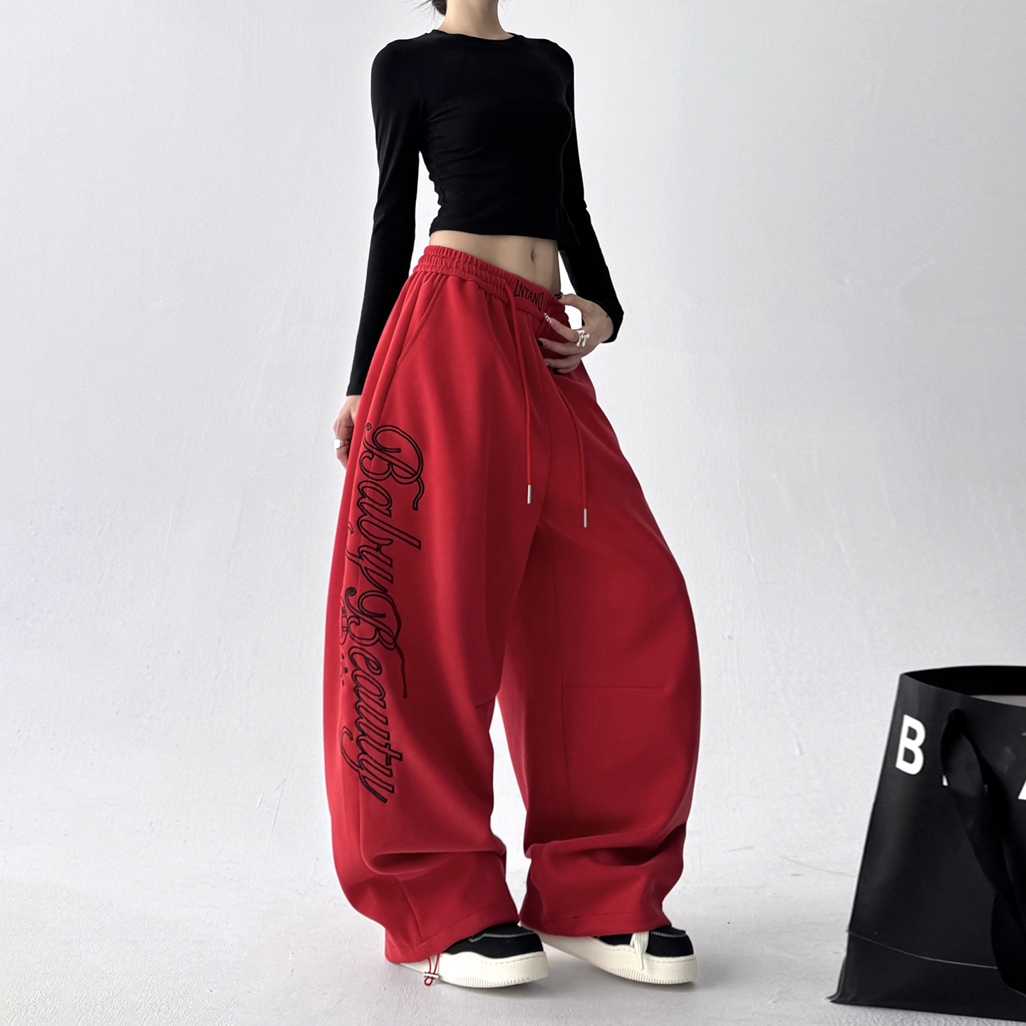 女高腰直筒阔腿长裤 红色2025秋季 宽松显瘦百搭休闲裤 韩版 子潮 新款