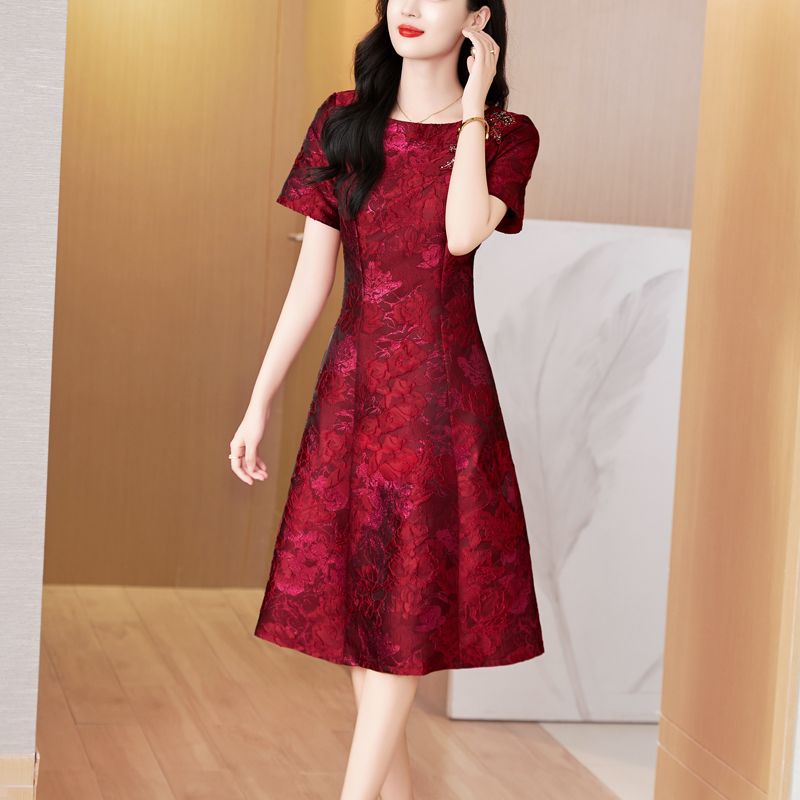 高端轻奢红色礼服A字裙女2025春秋新款 中国风收腰婆婆妈妈连衣裙